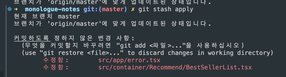 git stash apply : 가장 최근 stash 불러오기 && stash에 저장