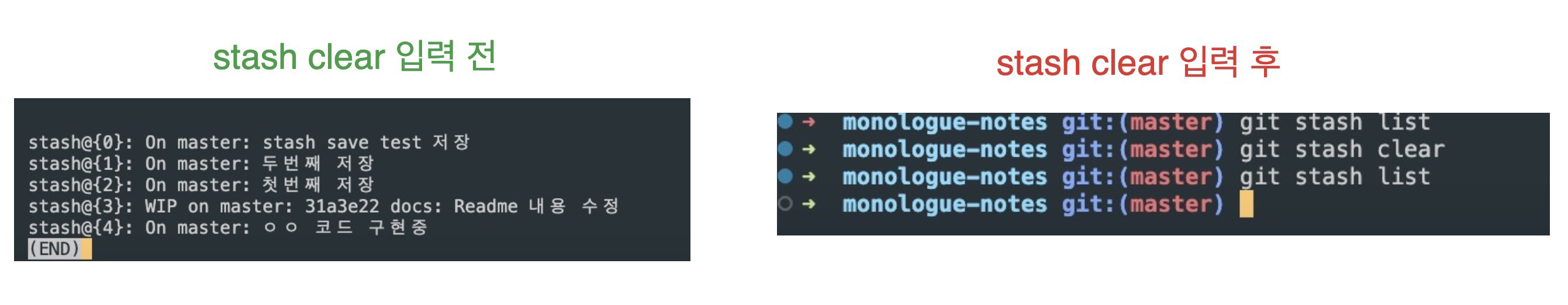 git stash clear : stash에 저장된 코드들 모두 제거