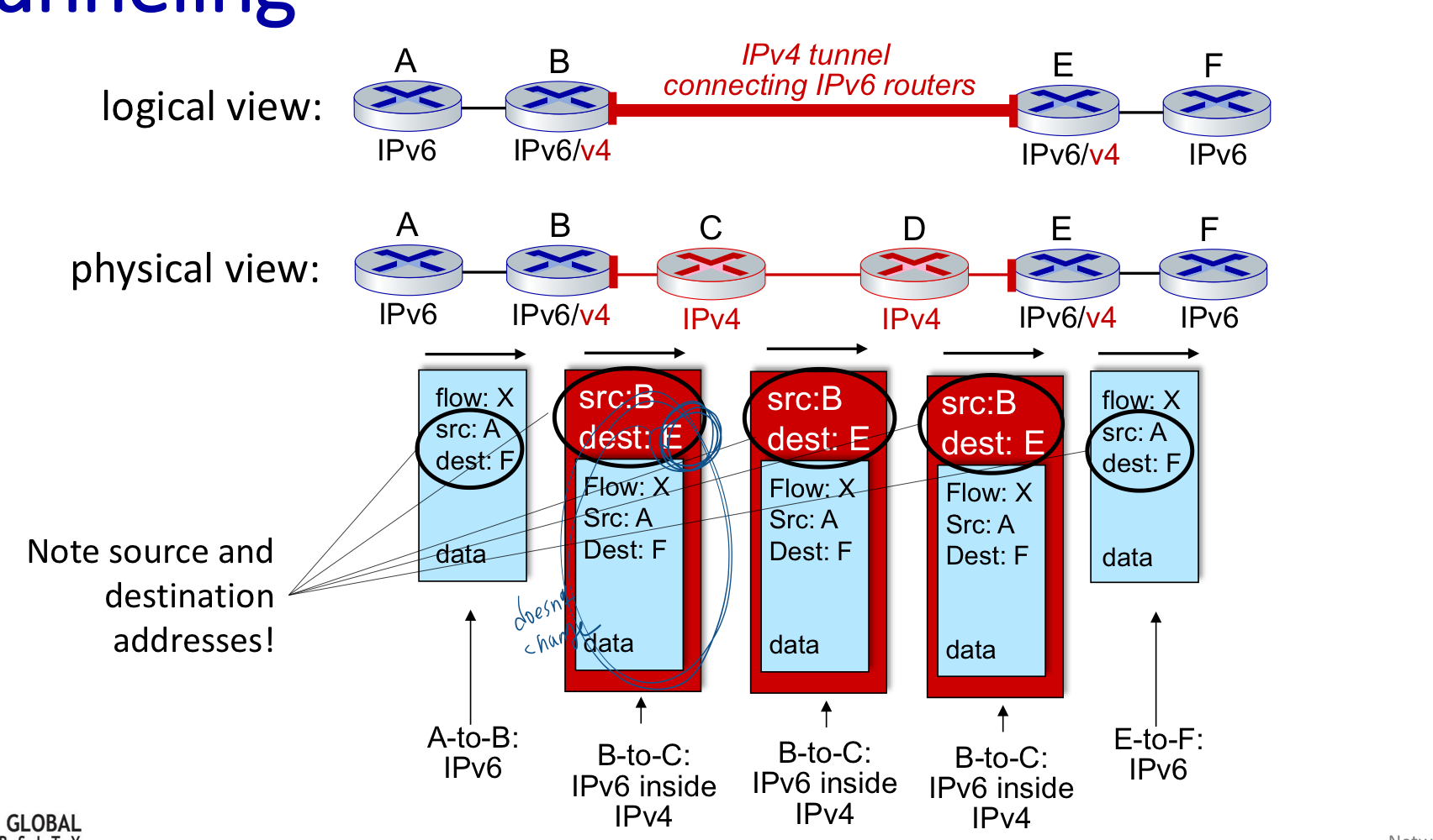 ipv6를 처리하지 못하는 CD를 지나야 . 할때는 ipv4 header안에 ipv6 datagram을 넣고, source ip, destination ip를 변경해서 전송한다. E가 받아서 header떼고 다시 ipv6의 datagram으로 처리함
