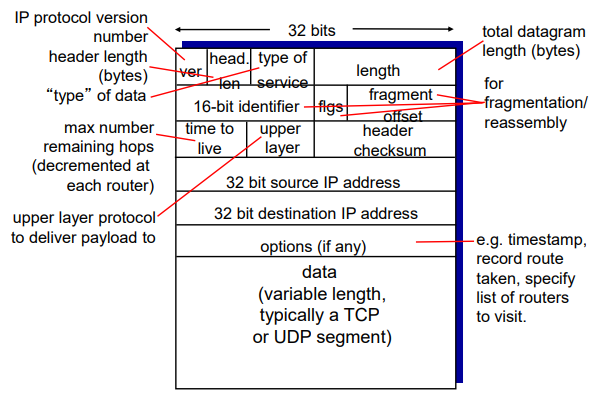 head.len: 4 bits => header size 기본적으로 20bytes이나 options 등으로 더 길어질 수도 있음