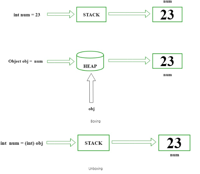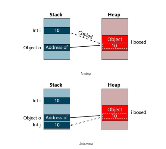 박싱이 일어날 땐 object 타입의 새로운 인스턴스를 생성해 값을 힙으로 복사하고, 언박싱이 이뤄질 땐 힙에서 스택으로 값이 복사된다
