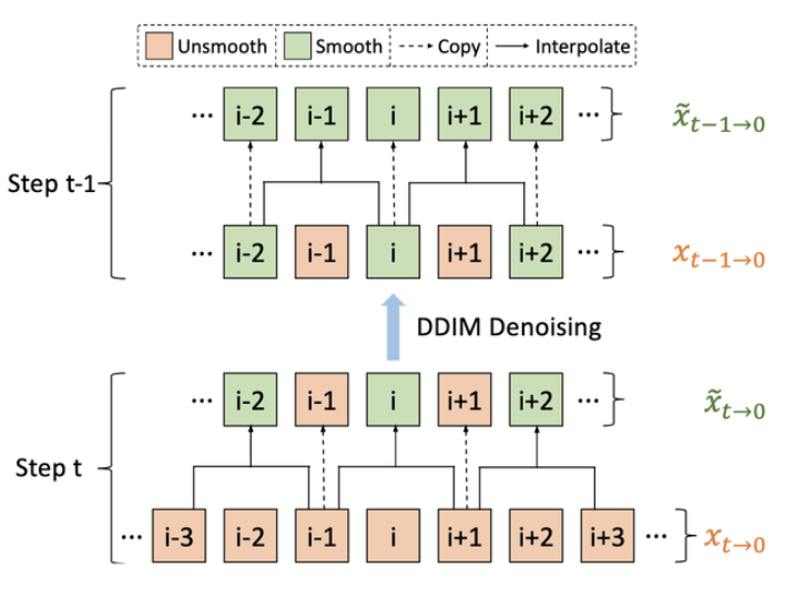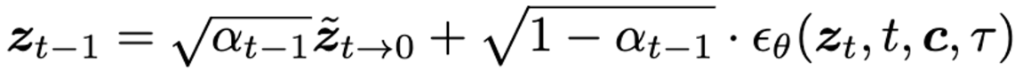 그 후 를 디코더 D에 태워 를 만듬. 그후 interleaved-frame smoother를 통해. 로 전환. 그다음 인코더 에 태워 를 만듬. 그 후 아래 DDIM 식으로 denosing 하여 을 만듬.