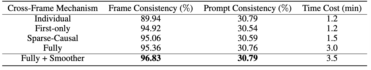 = {}에서는 t에 따른 latent frame을 나타내고, 는 를 q,k,v에 projection 시킨 것. Tune-A-Video, Text2Video-Zero에서는 모든 프레임들은 첫번째 프레임과의 attention만을 연산하여 대략적인 cross-frame mechanism을 구하는 방식으로 self-attention을 대체. 이 방식은 self-attention의 q와 k간의 불일치를 증가시켜 일관성을 저하시키는 문제가 있음. 하지만 저자들이 제안하는 fully cross-frame mechanism 방법은 모든 frame을 large image로 결합하고, text-to-image model과 생성 gap이 적음.
