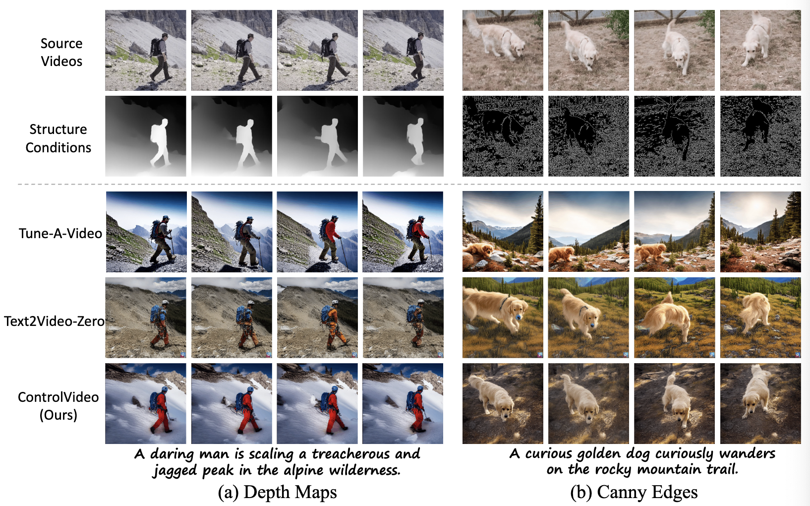 ControlVideo는 ControlNet에서의 auxiliary UNet를 유지하면서 시간 축을 따라 확장시킴. 3 × 3 커널을 1 × 3 × 3 커널로 대체함. 또한 모든 프레임에서 interaction을 추가하여 self-attention을 확장시킴.