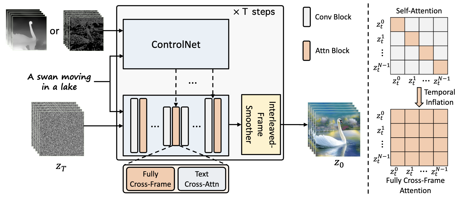 일관성을 유지하여 비디오 프레임들을 concatenate 하여 “large image”라는 것을 만들어야 함. inter-frame interaction을 통해 content는 유지 될 수 있음. SD는 attention으로 외관이 많이 바뀌므로 attention-based fully cross-frame interaction를 사용함하여 통일성을 주려 함.
