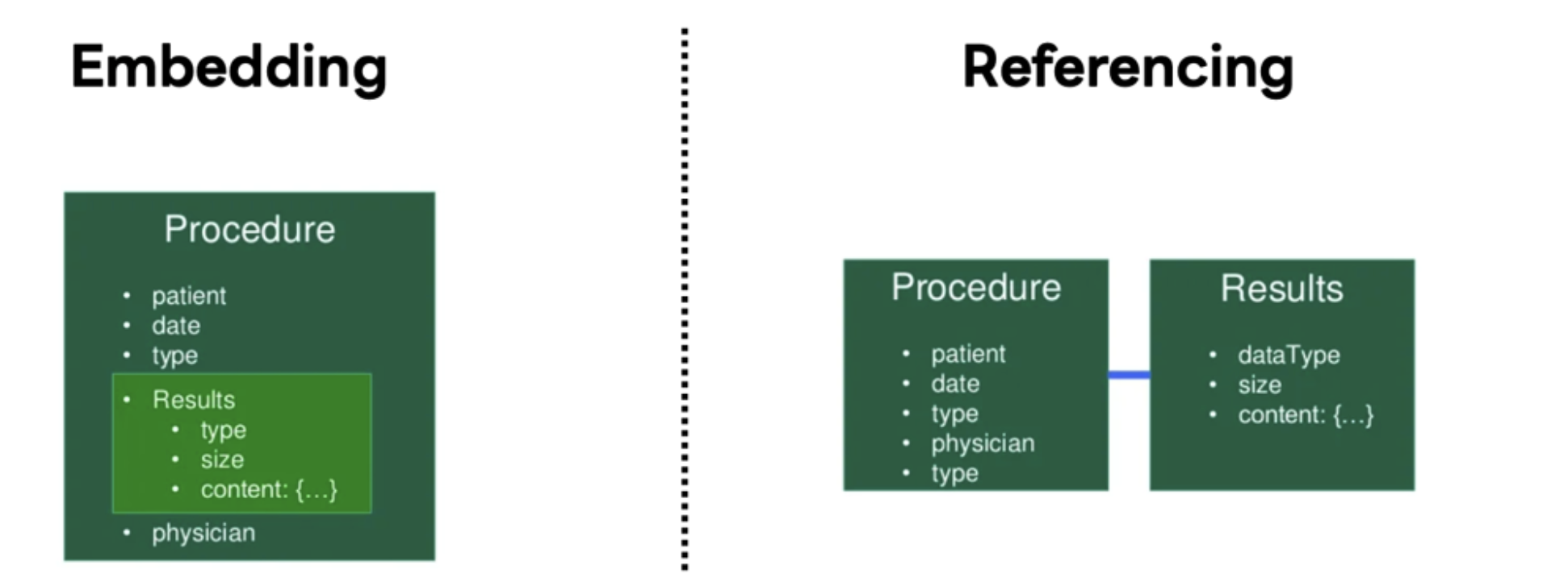 왼쪽처럼 데이터를 내장시키는 방식은 하나의 Collection만 조회해서 Read에 대한 속도가 빠르고 Document 단위로 원자성이 보장되어 데이터의 일관성을 유지시키는 방식이 쉽지만, 데이터의 중복이 발생하고 내장된 데이터의 수정이 필요하다면 모든 내장된 Document를 다 수정해야하기 때문에 Write에 대한 성능이 저하될 것이다.