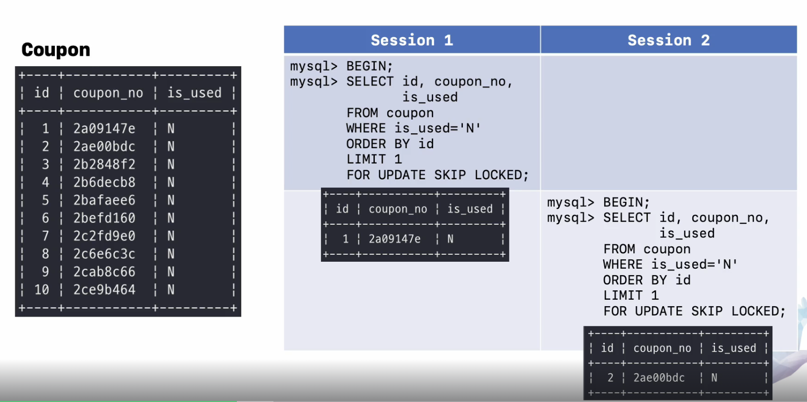잠금 대상 레코드 중에 다른 세션에 의해 잠금이 걸려 있는 레코드는 스킵하고, 잠금이 걸려있지 않은 레코드를 잠그고 반환