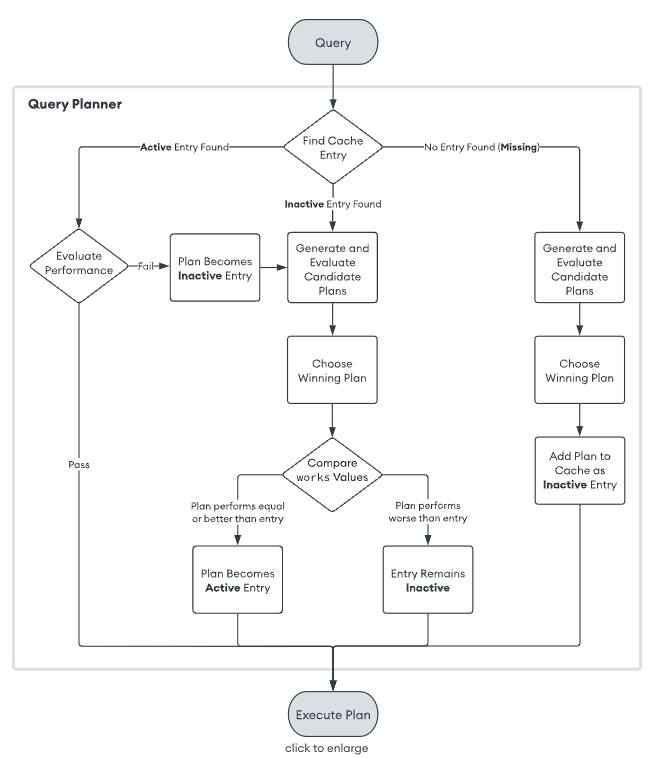 쿼리 최초 실행: 캐쉬에서 매칭되는 엔트리 확인(캐쉬에 존재하지 않음) -> 실행 계획 후보 생성 -> 후보 실행 계획 수행 -> 옵티마이저가 가장 빠른 계획을 위닝 플랜으로 선택 -> 캐쉬에 생성 후 반환