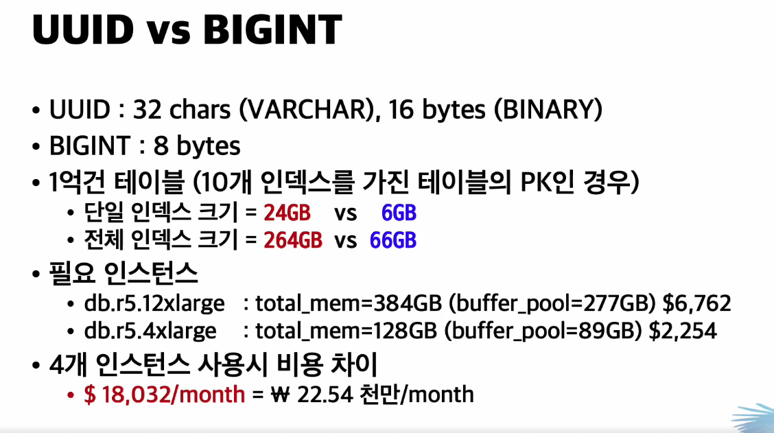 UUID가 PK로 사용될 때 모든 Second Index에 영향을 미처 저장공간을 더 많이 차지하게 된다.