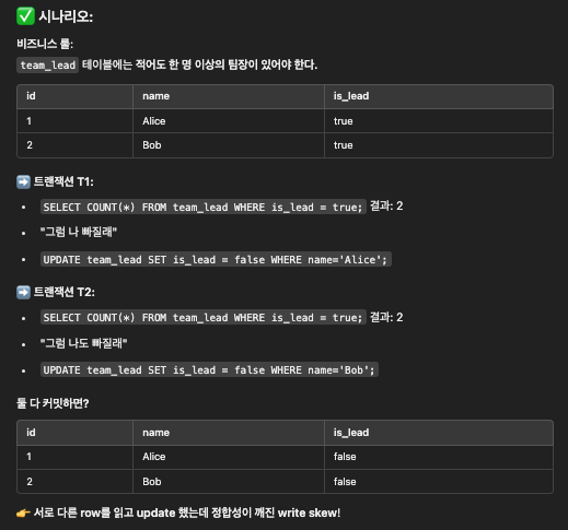 - 즉, 동일 조건을 읽었더라도 수정 대상 행이 다르면 두 트랜잭션 모두 커밋이 가능하여 Write Skew가 발생할 수 있습니다.