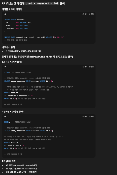 b. 동일한 조건을 읽고 다른 row의 업데이트를 시도해 비즈니스 규칙이 깨지는 예시