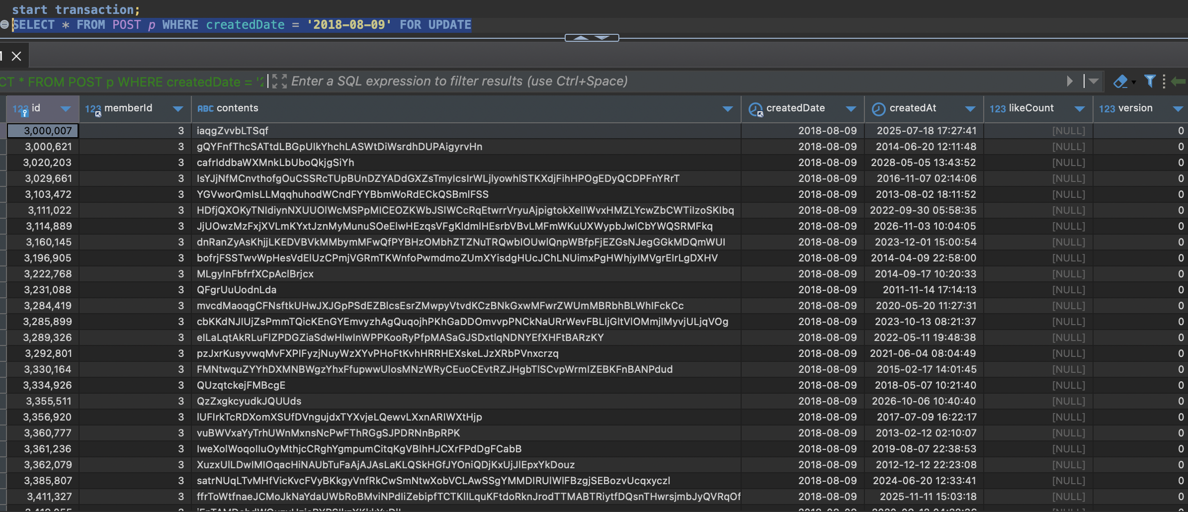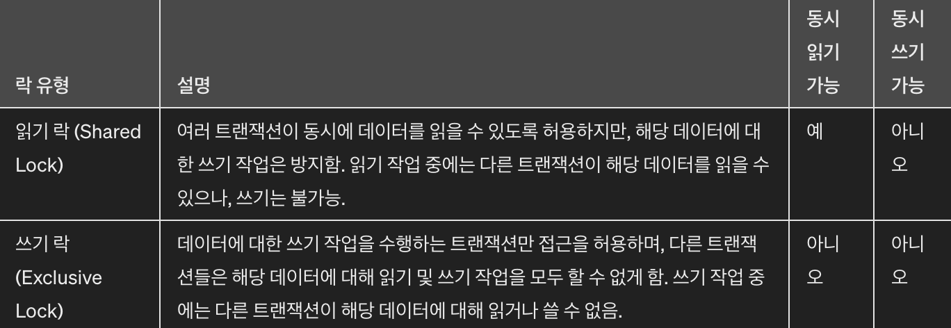 읽기 락 (Shared Lock): 데이터의 동시 읽기는 가능하지만, 쓰기는 허용되지 않는다. 이는 데이터의 일관성을 유지하면서 여러 트랜잭션이 동시에 읽을 수 있도록 한다. (SELECT ... FOR SHARE)