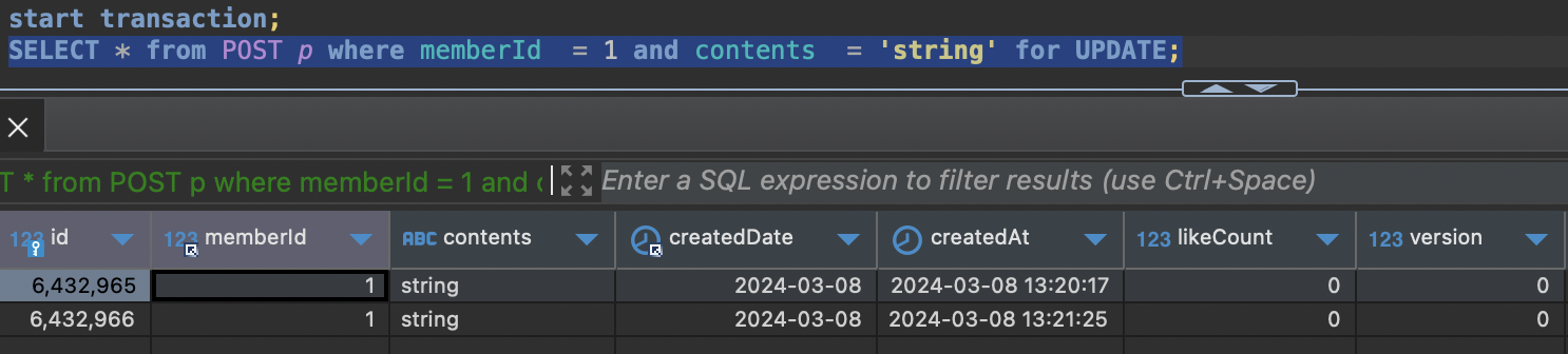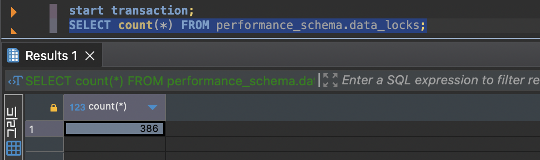 실행중인 락의 개수를 보면 where조건에 해당하는 컬럼만큼 락이 설정된 것을 볼 수 있다.
