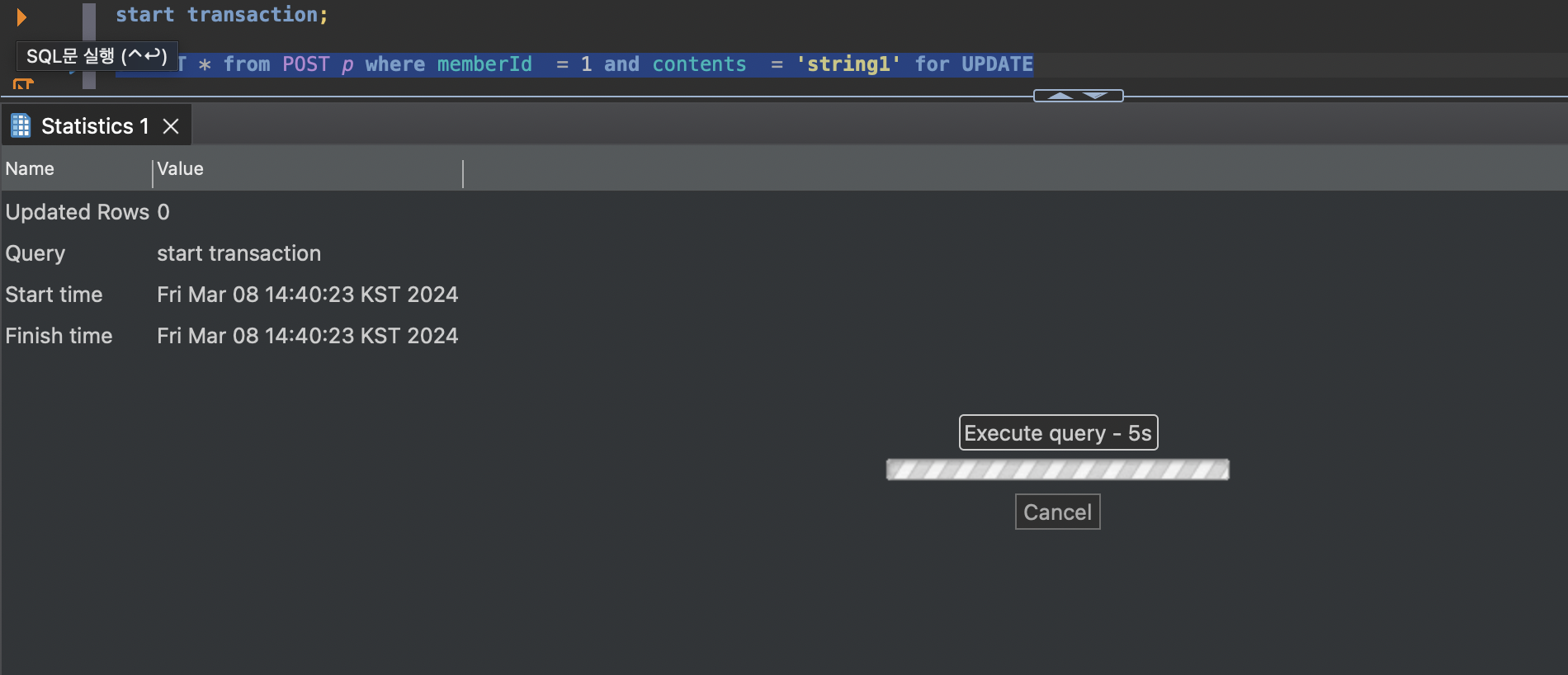 새로운 창에서 데이터를 쿼리를 실행하면 락이걸려 조회되지 않는다.