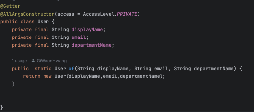 그래서 아래 이미지처럼, 해당 엔티티 내부에 정적(static) 팩토리 메서드를 정의해 외부에서 인스턴스를 생성할 수 있도록 구현했다.
