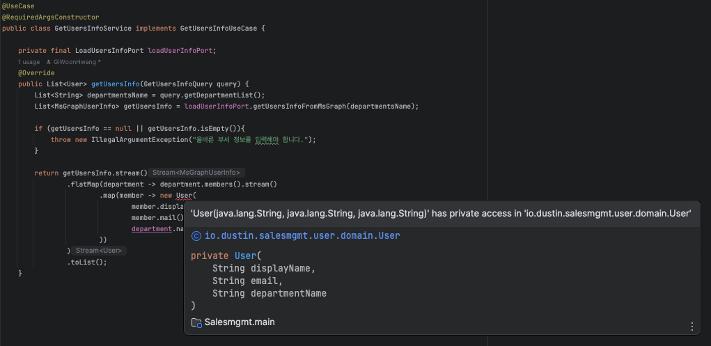 어플리케이션 레이어의 유스케이스에서 비즈니스 로직을 처리한 뒤, 도메인 객체를 반환하는 과정에서 흥미로운 상황이 발생했다.