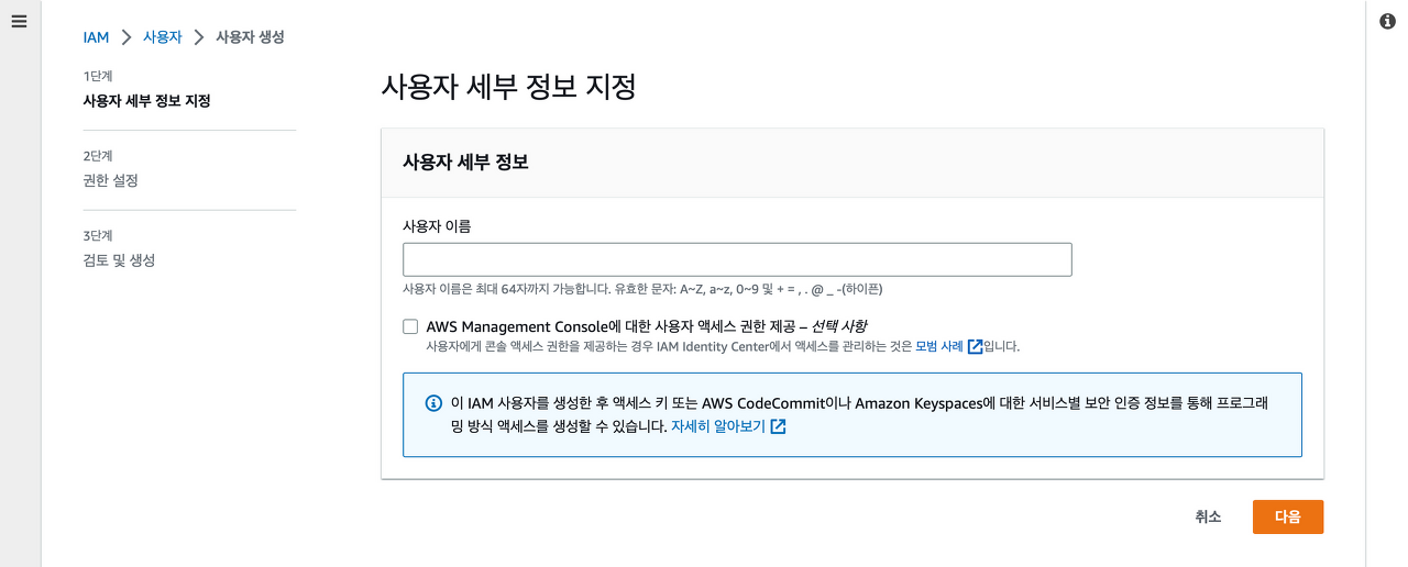 S3์ ์ ๊ทผํ๊ธฐ ์ํด์๋ IAM ์ฌ์ฉ์์๊ฒ S3 ์ ๊ทผ ๊ถํ์ ์ฃผ๊ณ , ์์ธ์ค ํค๋ฅผ ๋ง๋ค์ด ์์ธ์ค ํค์ ๋น๋ฐ ํค๋ฅผ ํตํด ์ ๊ทผํด์ผ ํ๋ค. ์ด๋ฏธ IAM ์ฌ์ฉ์๋ก ๋ก๊ทธ์ธํด ์๋ ๊ฒฝ์ฐ์๋ ์์ฑํ๋ ๊ณผ์ ์ ์๋ต ํ ๋ฐ๋ก ์ค์ ํ๋ฉด ๋๋ค.