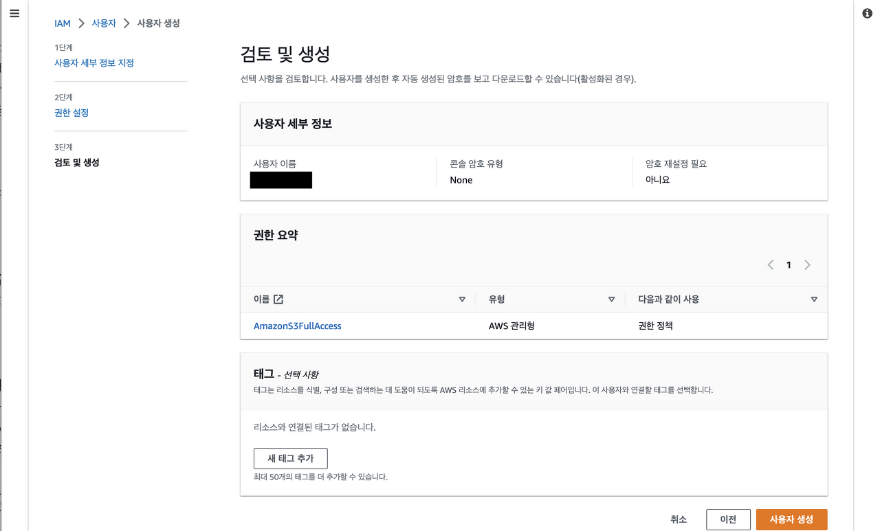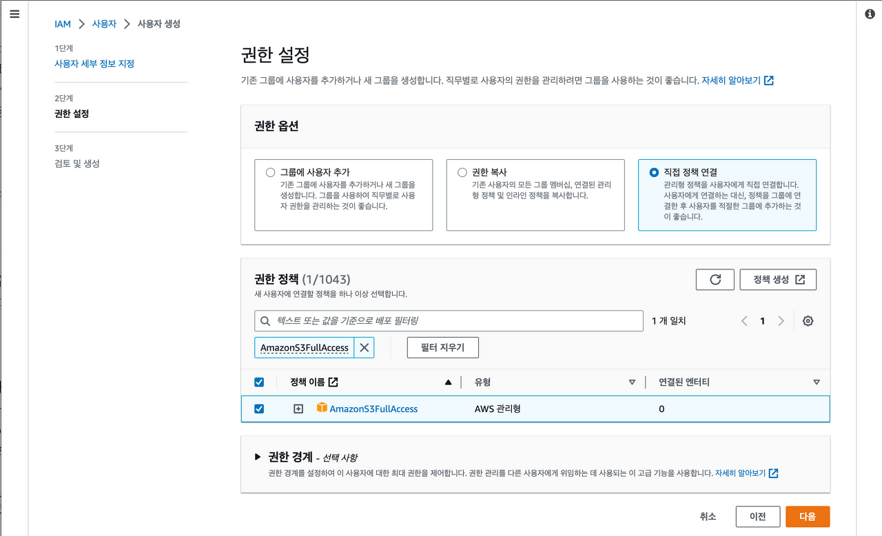 AmazonS3FullAccess๋ฅผ ์ ํํ๋ค.