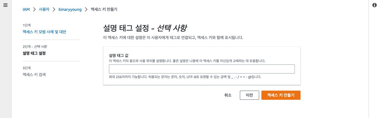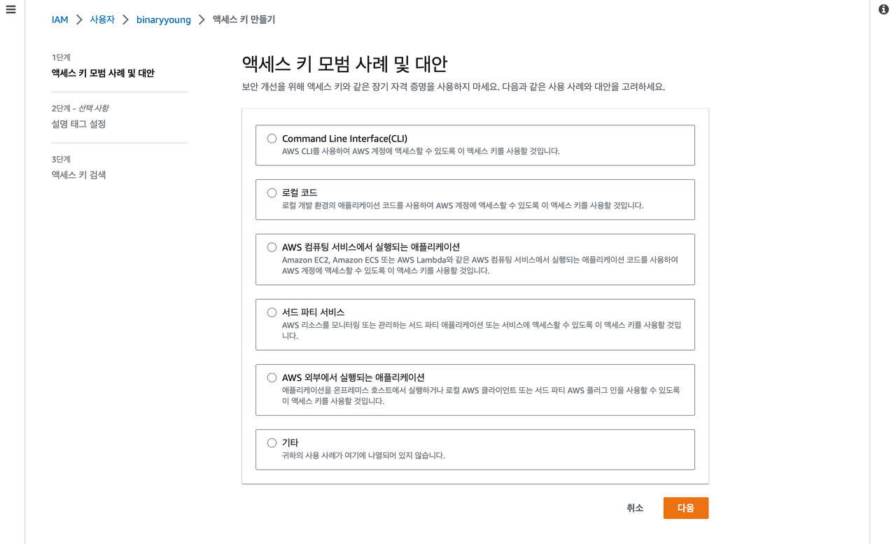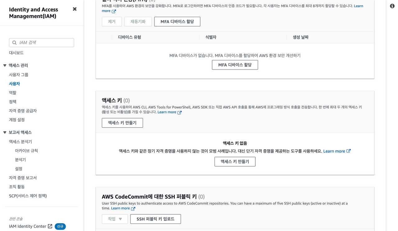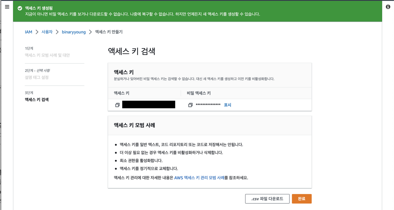 ์ธ๋ถ ์๋ฒ์์ ์ ์ํ ์ ์๋๋ก IAM ์ฌ์ฉ์์ ์์ธ์ค ํค๋ฅผ ์์ฑํด์ผ ํ๋ค. ์ด๋ ์์ธ์ค ํค์ ๋น๋ฐ ํค๋ ์ธ๋ถ์ ๊ณต๊ฐ๋์ด์๋ ์๋๋ค.