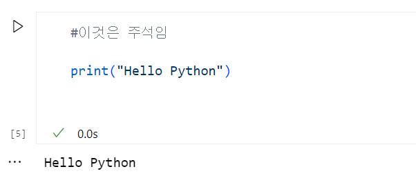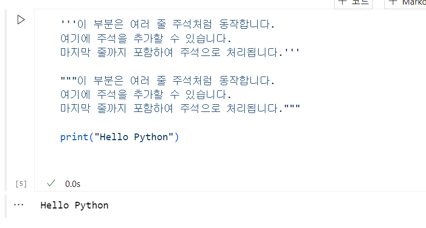 코드를 작성할 때 실행되지 않는 설명을 작성하는 부분을 주석(Comment)라고 함 1) 한줄주석 : # 2) 여러줄 주석 : ''' OR """ (주석 대신 문자열객체로 인식하기때문에 코드의 의도를 설명하기 위해 주석처럼 사용 가능)