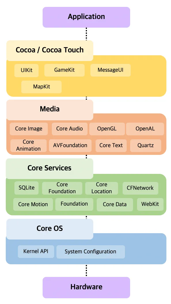 consist of "Cocoa/Cocoa Touch", "Media","Core Services", "Core OS"