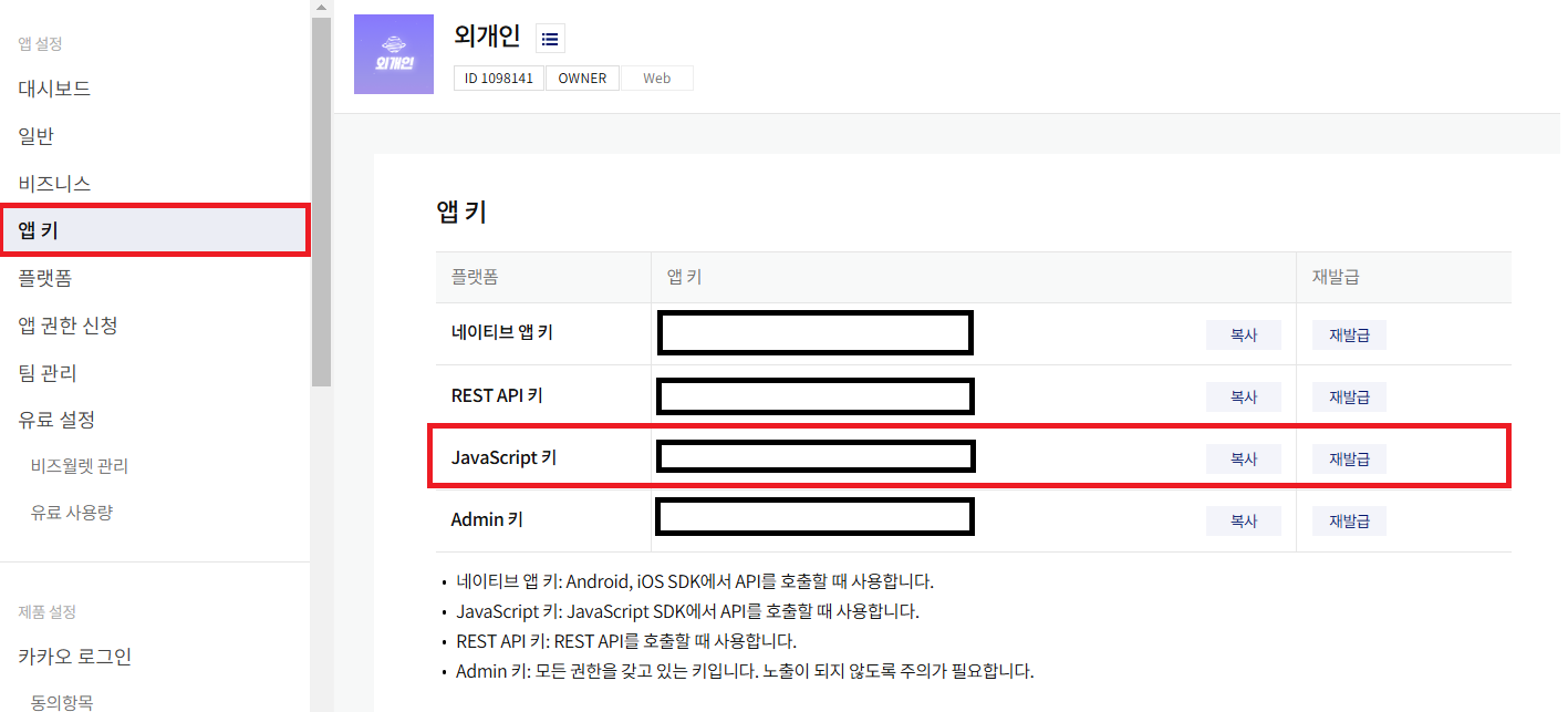 이렇게 앱에 대한 자세한 설정페이지로 이동하게 된다. 앱 키를 클릭하면 다양한 플랫폼들에 대한 앱 키를 확인할 수 있다. 우린 웹이기 때문에 JavaScript 키를 사용할 예정이다.