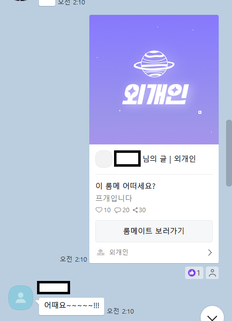 외개인 프로젝트에서는 사용자들이 다른 사람의 프로필을 열람할 수 있는 기능을 제공한다. 사용자 프로필 페이지를 통해 사용자는 다른 사람의 프로필 정보를 확인하고, 자신의 취향과 일치하는 경우 매칭 신청을 할 수 있다. 우리는 더 나아가 프로필을 공유하는 기능도 추가하고 싶었다. 예를 들어, 나의 프로필을 다른 사람에게 공유하거나, 다른 사람의 프로필을 내 친구에게 공유하여 소개시켜줄 수도 있다. 우리는 카카오톡 메시지 공유하기 API를 이용하여 공유 기능을 개발하기로 결정했다.