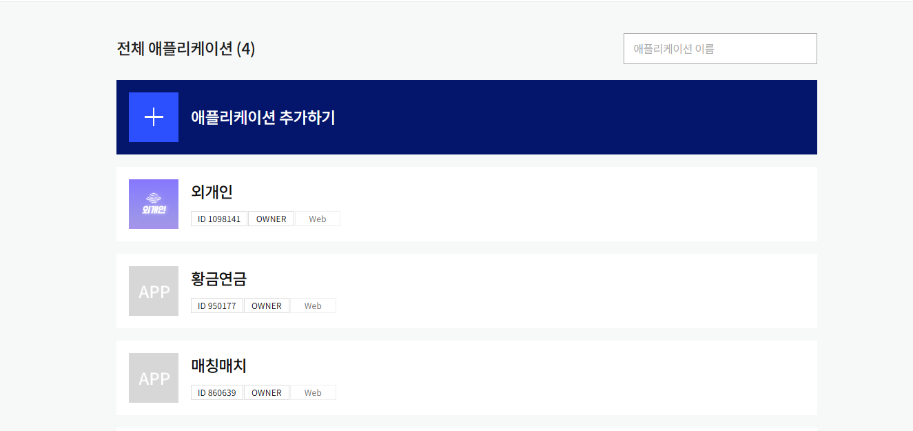 그러고 나서 애플리케이션 추가하기를 눌러서 애플리케이션을 등록하면된다. 그러면 추가하기 버튼 밑에처럼 애플리케이션이 생생된 것을 볼 수 있다. 생성된 애플리케이션을 클릭하면