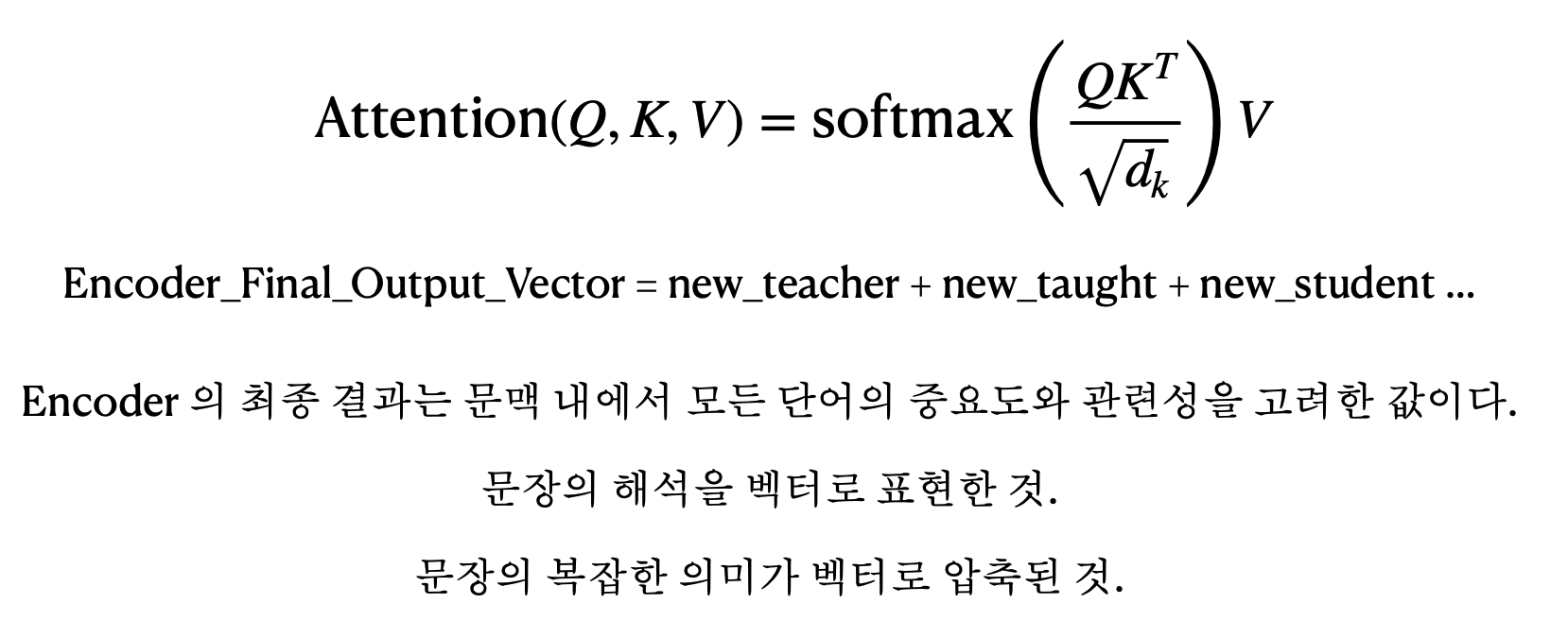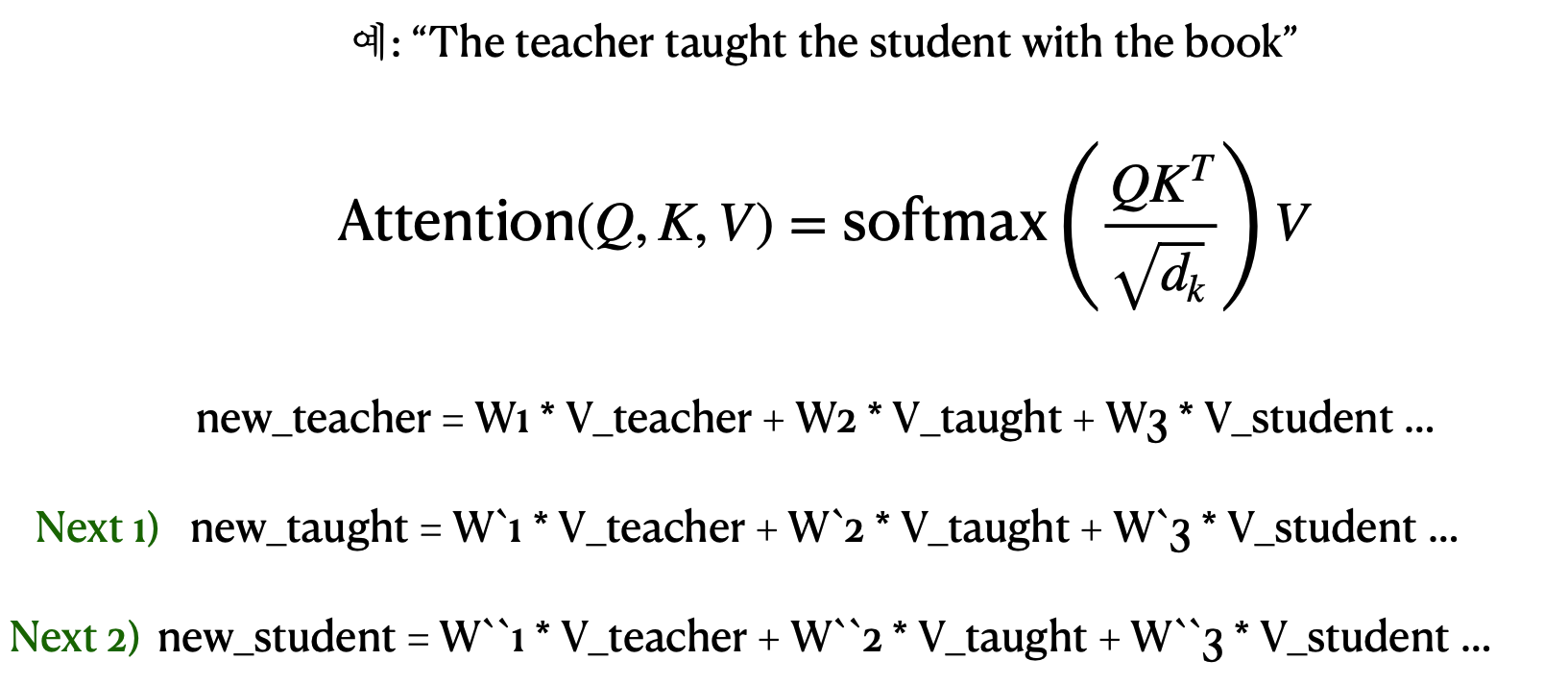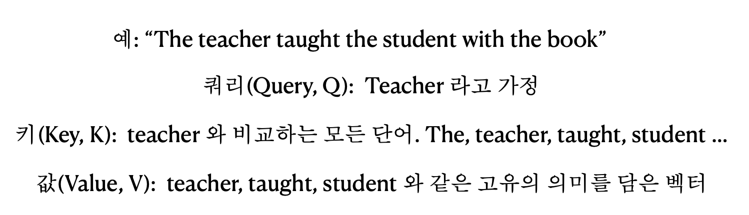 쿼리벡터와 키벡터 사이의 관련성을 측정 -> 각 단어가 쿼리에 얼마나 기여하는지에 따라 가중치 값을 생성 -> 값들을 바탕으로 새로운 값 벡터를 생성 -> 이 과정을 모든 단어에 적용 -> 최종 아웃풋 생성