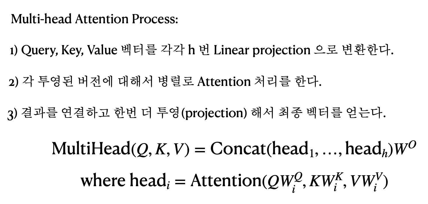 위의 2번에서 설명한 진행과정에서 여러개의 헤드로 나눠서 독립적, 병렬적으로 처리한다. 헤드는 하나의 어텐션 매커니즘을 의미하며 입력 텍스트의 해석을 하나의 관점에서만 보는게 아니라 여러 관점에서 보기 위한 것이다.