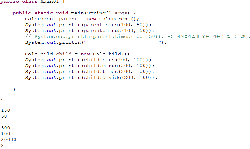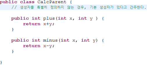 - CalcChild 클래스는 CalcParent 클래스를 상속받기 때문에 별도의 소스 코딩 없이도 plus()메서드와 minus()메서드를 포함하게 된다.