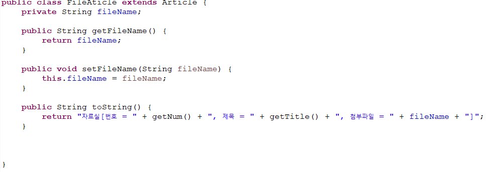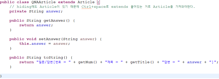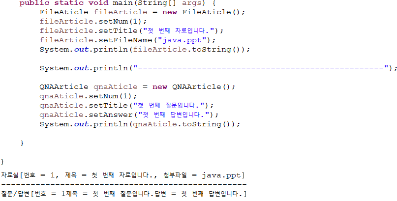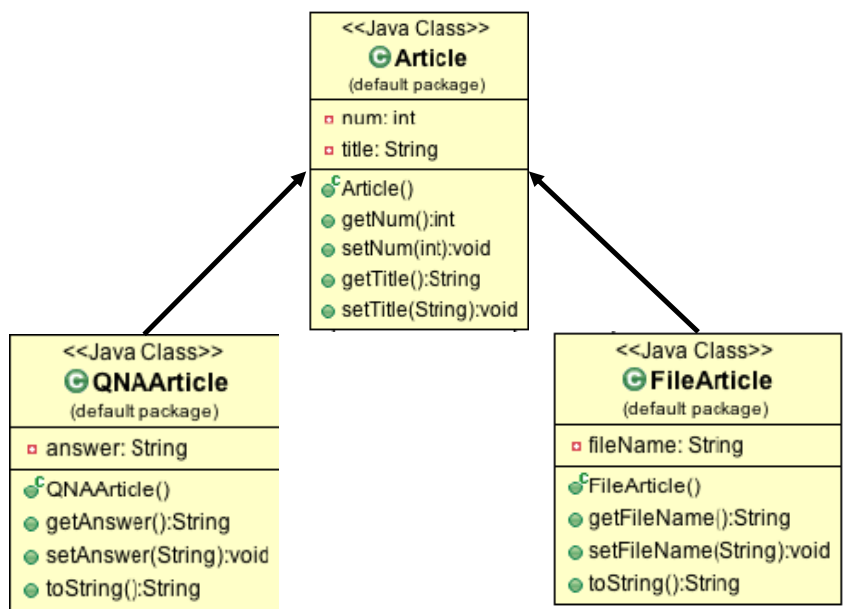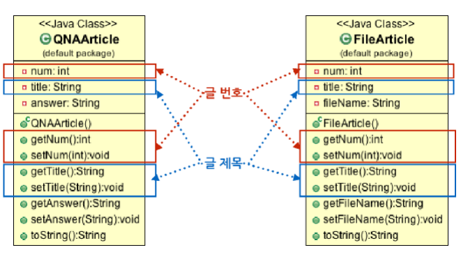 - 질문/답변 게시물의 한 단위를 표현하기 위한 QNAArticle 클래스와 자료실의 게시물을 표현하기 위한 FileArticle은 글 번호와 제목이라는 공통된 특성을 갖는다.