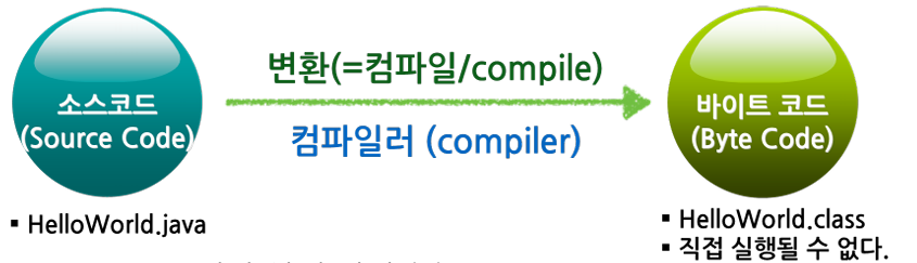 - 고급언어 : 사람이 이해할 수 있는 수준의 언어(java, c, c++), 기계어로 변환되어야만 프로그램 형태로 실행하는 것이 가능