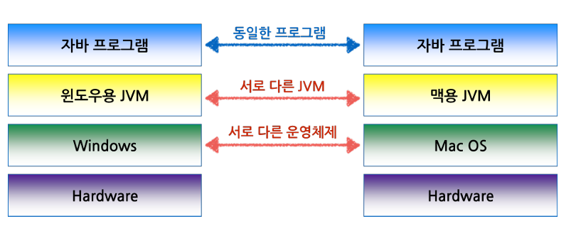- 자바프로그램은 jvm이 설치된 환경이라면 운영체제나 하드웨어에 종속되지 않고 실행이 가능