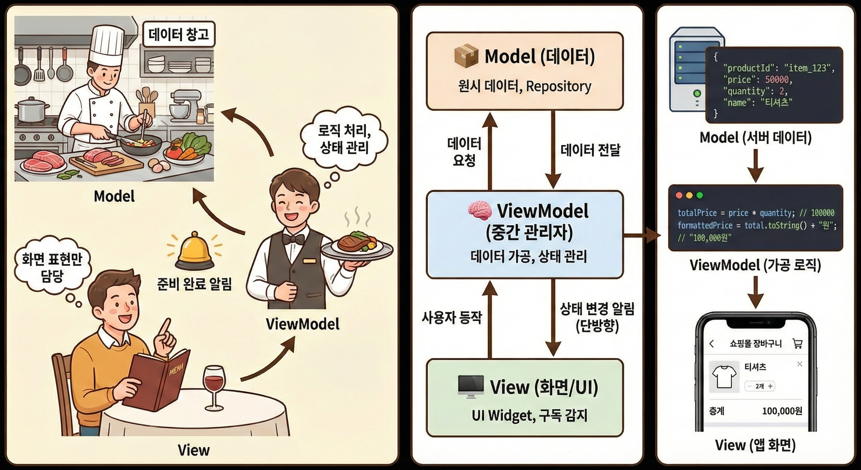 ViewModel 상태를 구독(watch) 하고 메서드 호출(read) 가능
