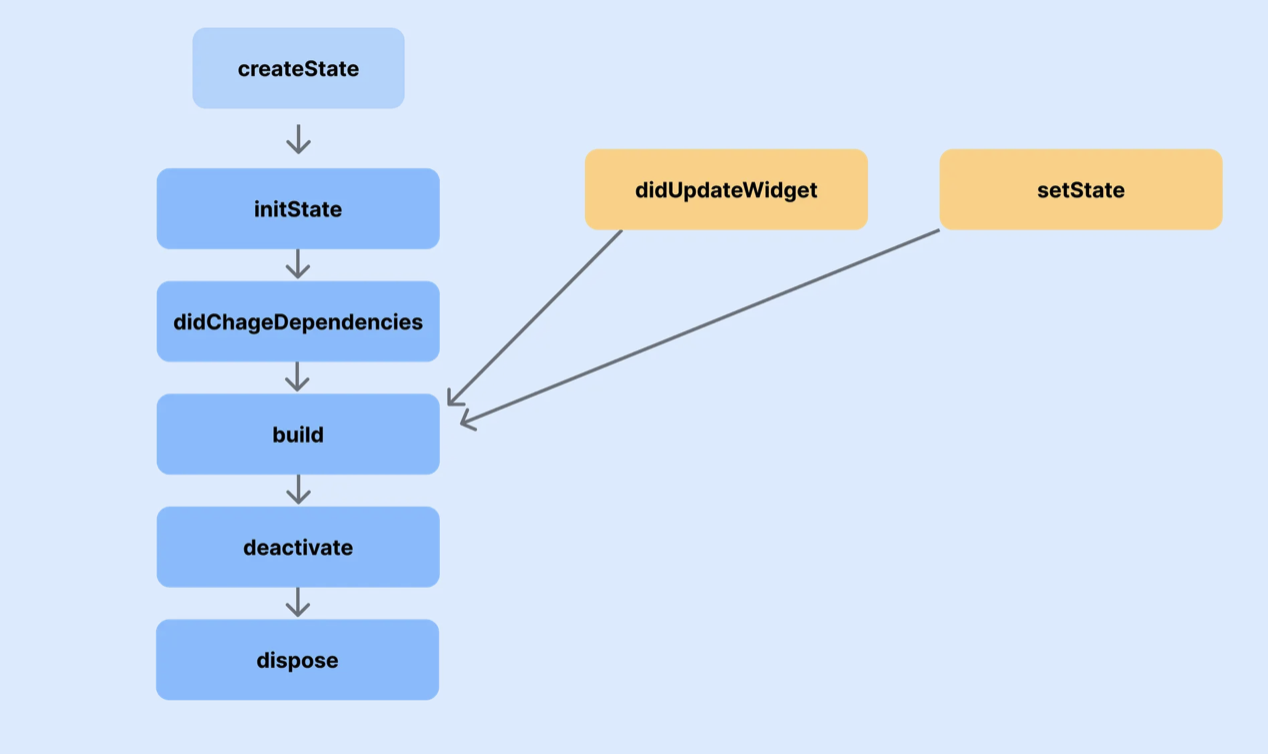 StatefulWidget이 생성 → 화면에 표시 → 업데이트 → 제거되는 전체 흐름