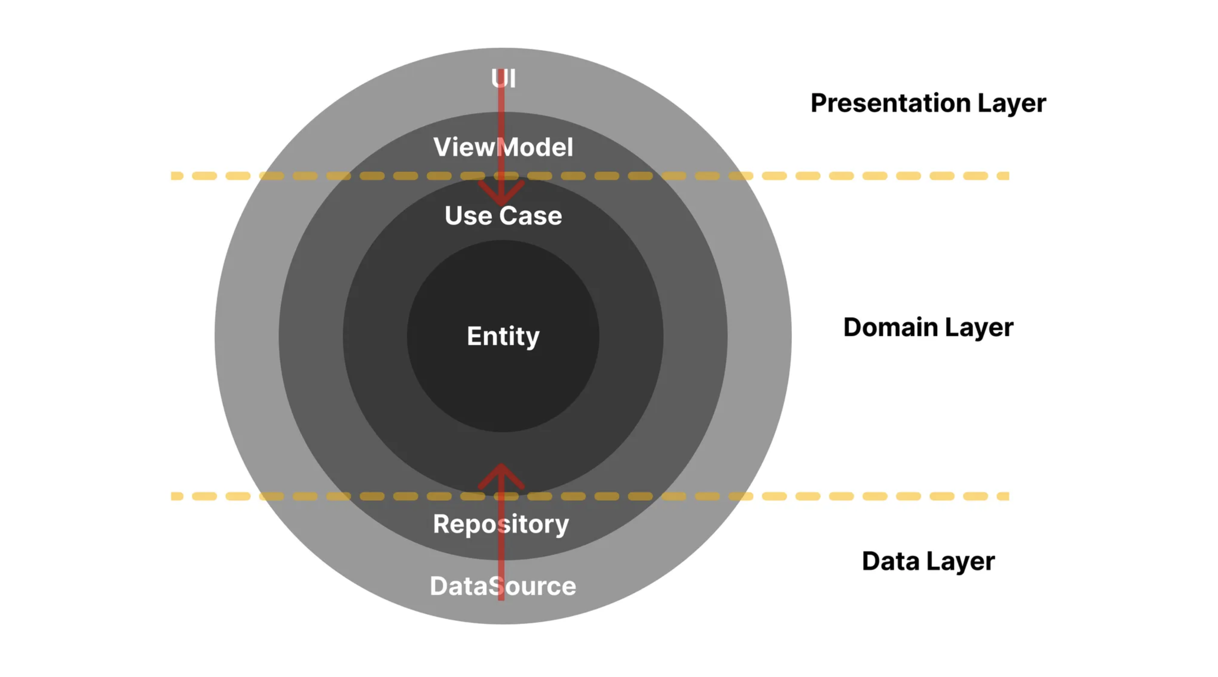 Entity : ๋น์ฆ๋์ค์ ํต์ฌ ๋ฐ์ดํฐ ๋ชจ๋ธ (์: Movie)UseCase : ์ฑ์ด ์ํํด์ผ ํ ๊ตฌ์ฒด์ ์ธ ๊ธฐ๋ฅ ๋จ์ (์: FetchMoviesUseCase)Repository Interface : "๋ ์ด๋ฐ ๋ฐ์ดํฐ๊ฐ ํ์ํด"๋ผ๊ณ ์ ์๋ง ํด๋ ๋ช