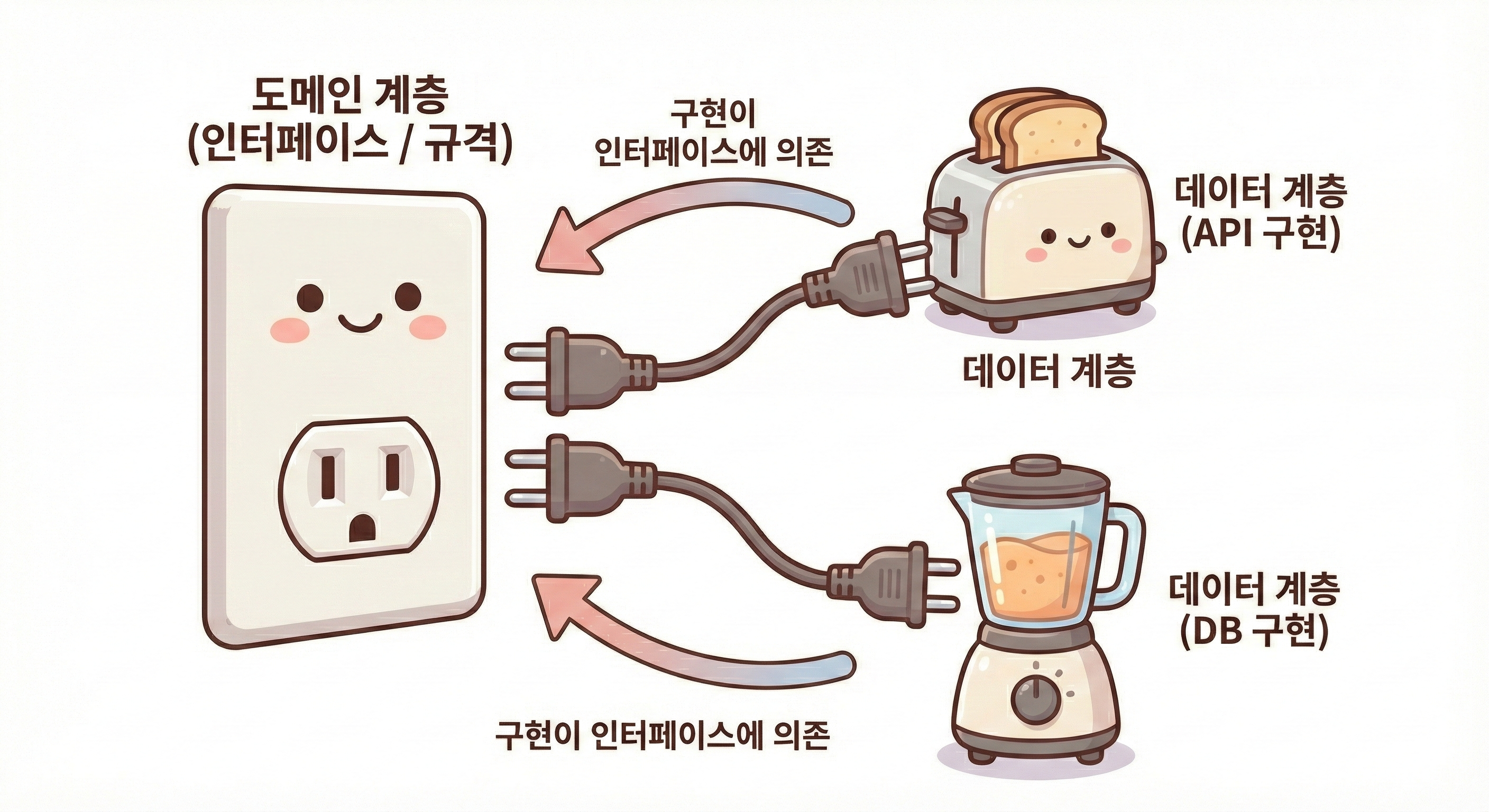 Repository Impl : Interface๋ฅผ ์ค์ ๋ก ๊ตฌํํ์ฌ UseCase์ ๋ฐ์ดํฐ ์ ๋ฌDataSource : ์ค์ ๋ฐ์ดํฐ์ ์ ๊ทผ (๋คํธ์ํฌ ํต์ , ๋ก์ปฌ DB)DTO (Data Transfer Object) : ์๋ฒ์์ ์ค๋ ๋ฐ์ดํฐ ํํ ๊ทธ๋๋ก๋ฅผ ๋ด๋ ๊ฐ์ฒด (Entity์ ๋ถ๋ฆฌํ์ฌ ์๋ฒ ๋ณ๊ฒฝ์ ๋์)์ค์: Domain์ Data๋ฅผ ๋ชจ๋ฅธ๋ค