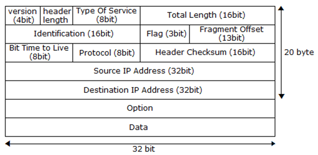 일반적으로 IP헤더의 크기는 20byte (option 사용(선택사항)시 60byte)
