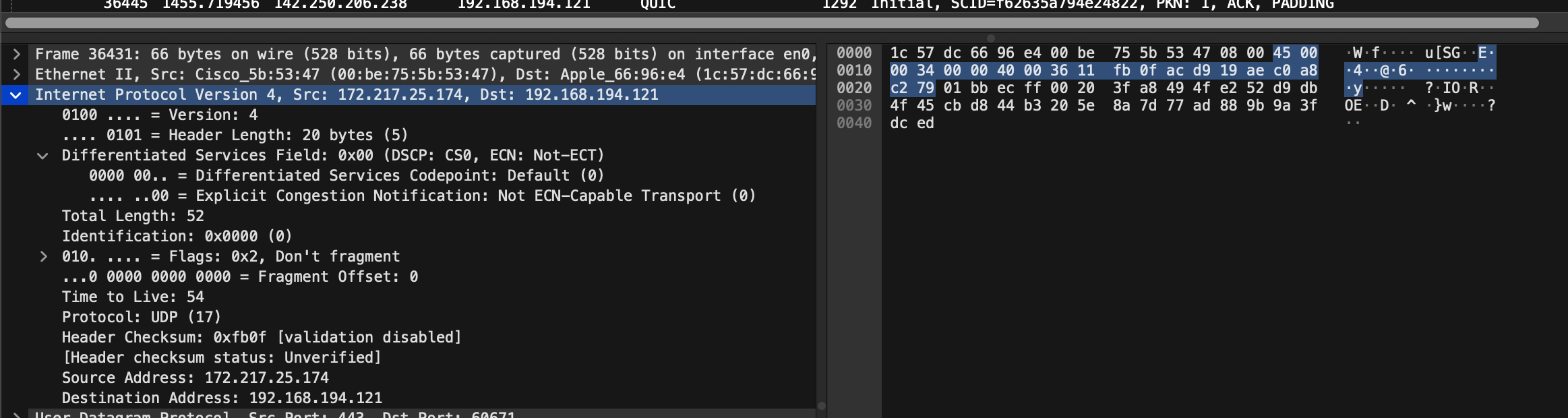 해당 패킷을 보면 원래는 2진수지만 와이어샤크로 보여주기 쉽게하기 위해 16진수를 사용