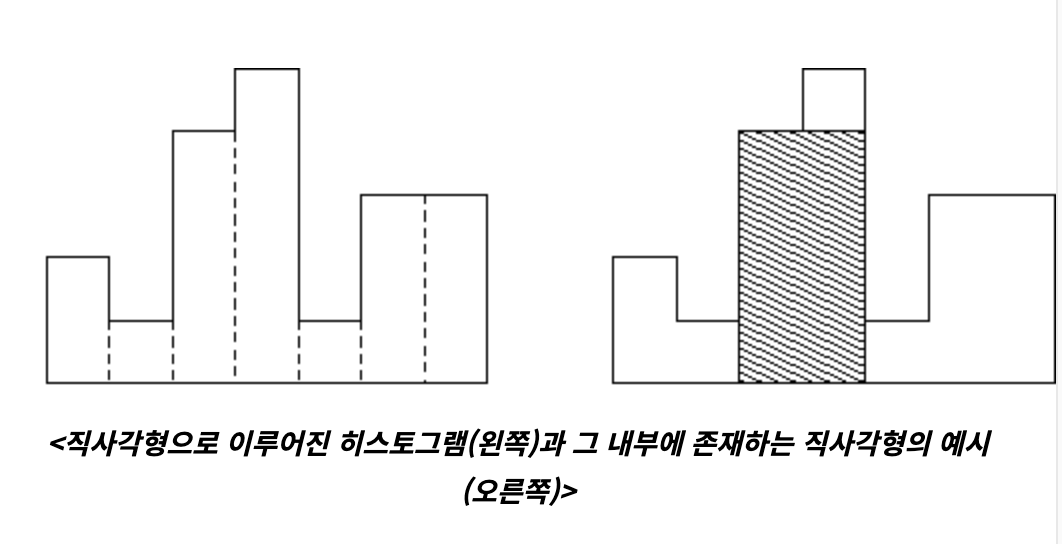 아래에서 보는 그림처럼 서로 폭이 모두 같은 직사각형들이 서로 밀착하여 바닥에 붙어있는 모양을 상상해보자. 이 도형의 내부를 2차원적으로 생각해 보았을 때, 이 히스토그램의 바닥면과 옆면의 방향에 평행한 변을 가지는 직사각형이 존재할 수 있다.