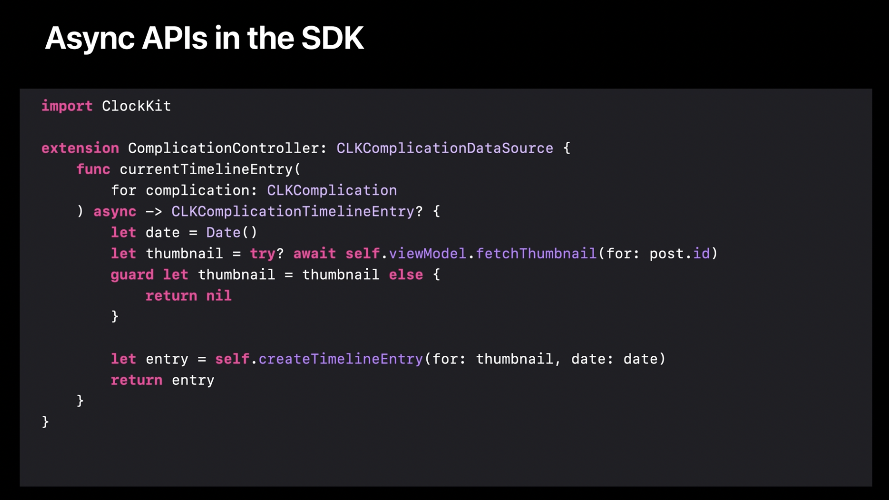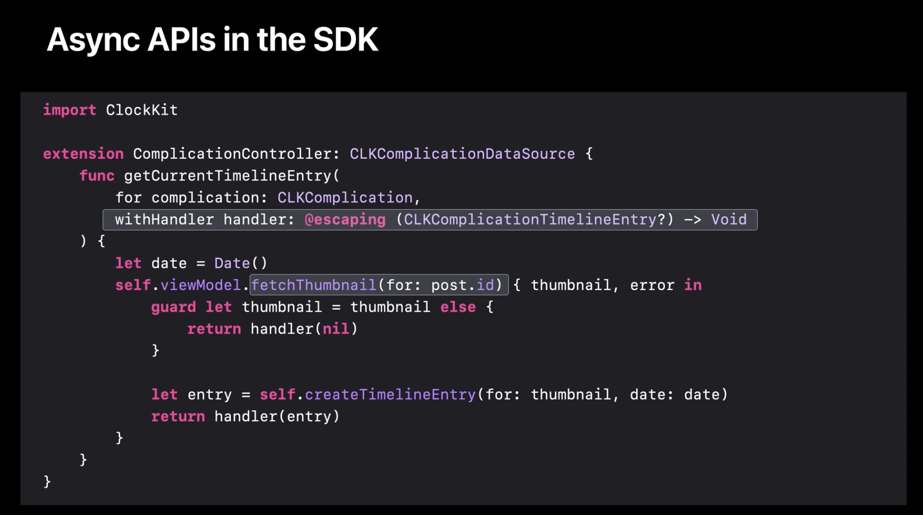 예를 들어, ClockKit 컴플리케이션 데이터 소스에서 fetchThumbnail을 호출하여 특정 게시물에 대한 타임라인 항목을 표시하는 경우를 생각해봅시다. 이전과 마찬가지로, 모든 코드 경로에서 완료 핸들러를 호출해야 합니다. 그리고 클로저로 인해 불필요한 코드가 많아져 가독성이 떨어지는 문제가 있습니다.