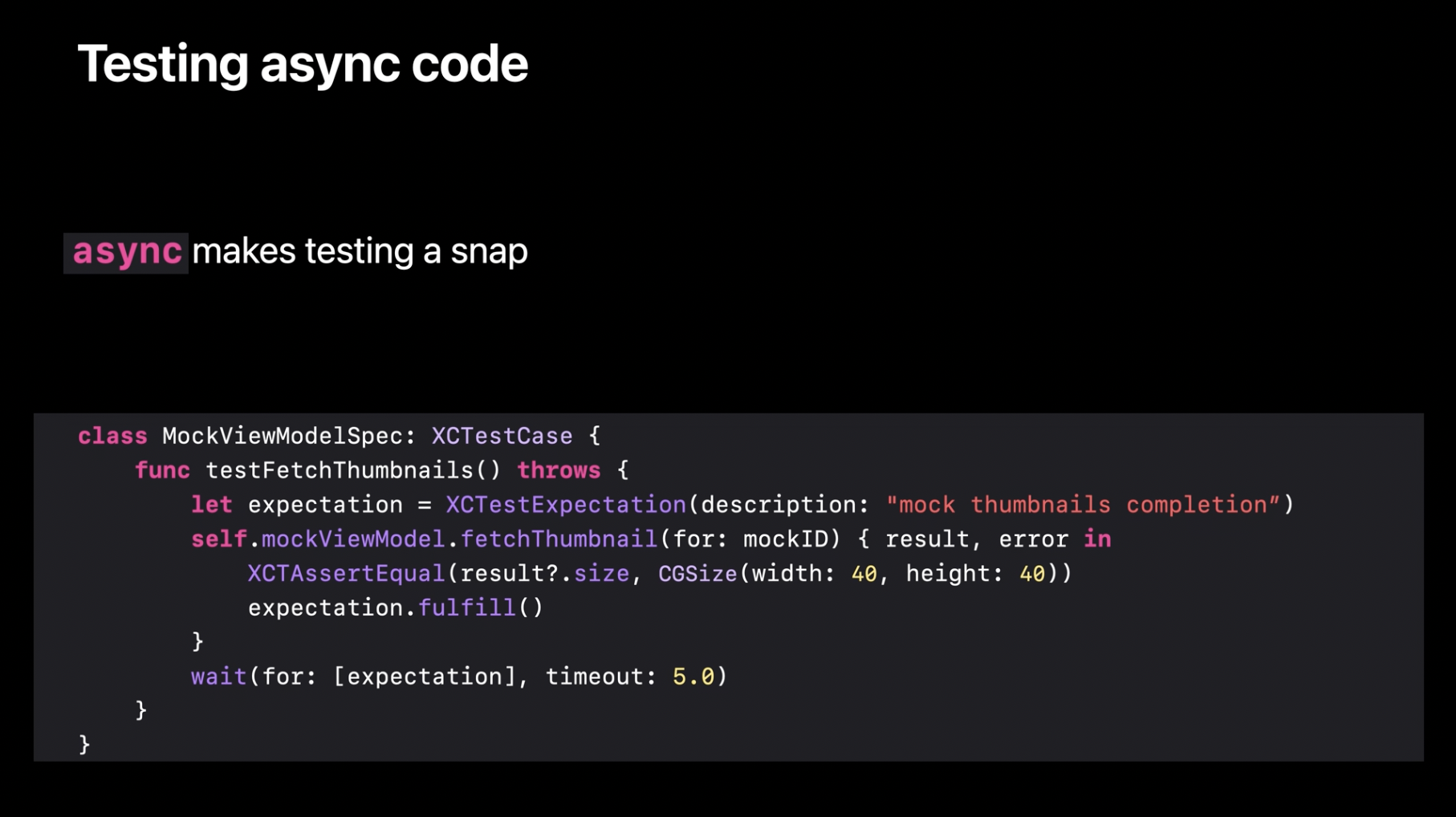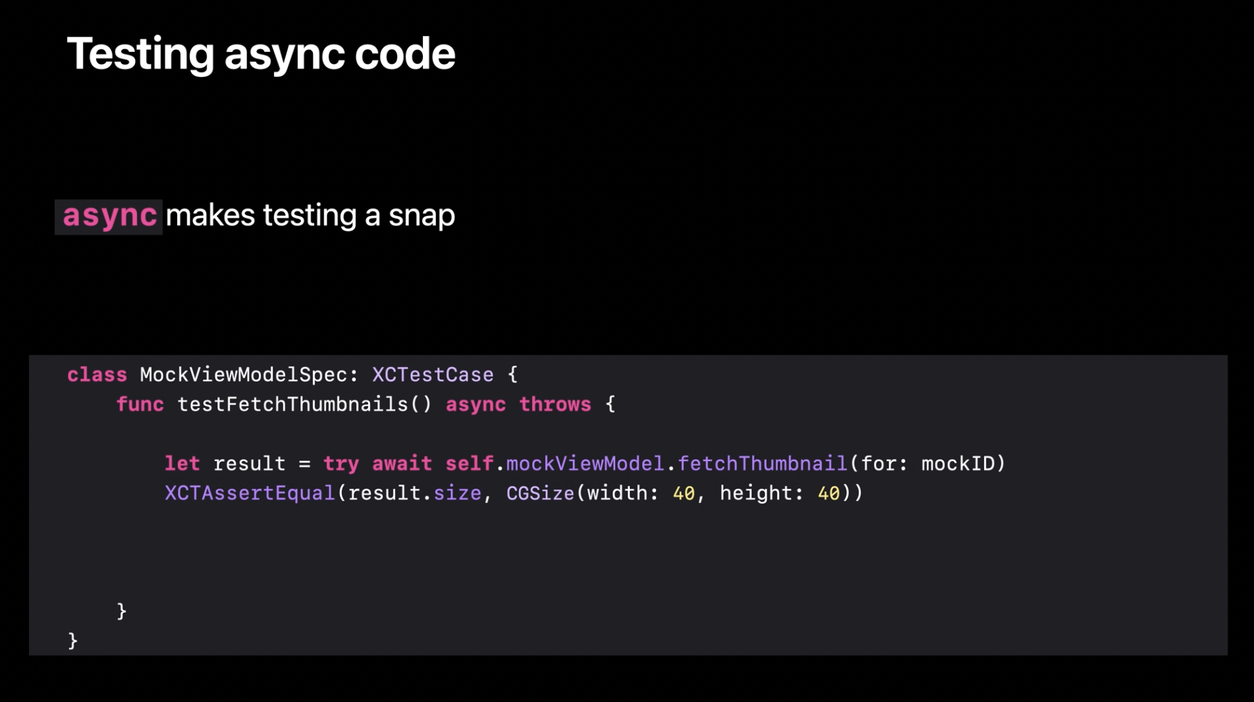 현대 소프트웨어 개발에서 중요한 것부터 시작해 보겠습니다. 바로 테스트입니다. 우리는 비동기 코드를 동기 코드만큼 쉽게 테스트하기를 원했고, 그래서 XCTest는 기본적으로 async를 지원합니다.