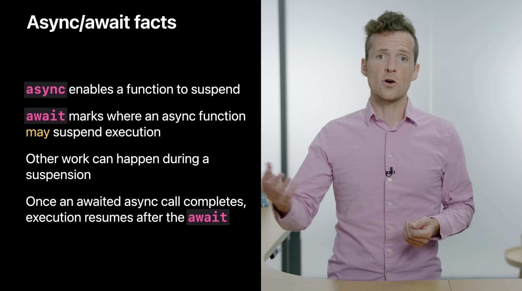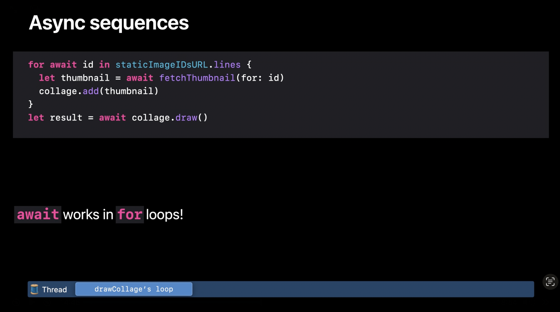 이 함수가 비동기 시퀀스를 반복적으로 순회할 때, 다음 요소를 기다리는 동안 스레드는 해제될 수 있으며, 그런 다음 반복문의 구현부에서 다음 요소와 함께 재개되거나, 남은 요소가 없으면 반복문 이후로 다시 재개될 수 있습니다. 비동기 시퀀스에 대해 더 알고 싶다면 “Meet AsyncSequence” 세션을 시청하세요. 또한, 여러 비동기 작업을 병렬로 실행하는 것에 관심이 있다면 “Structured Concurrency in Swift” 세션을 확인해 보세요.