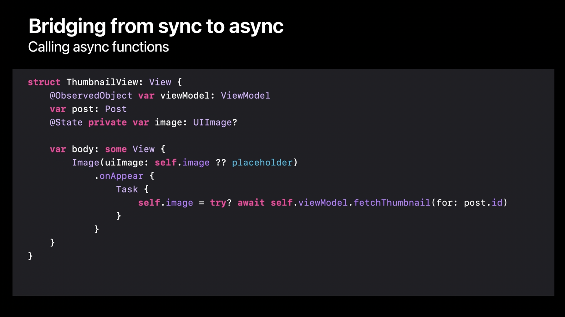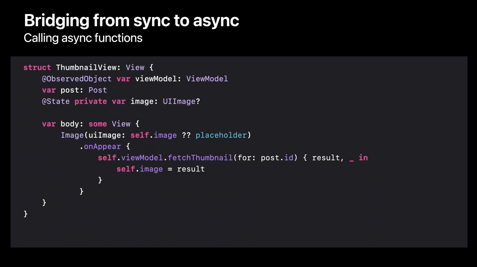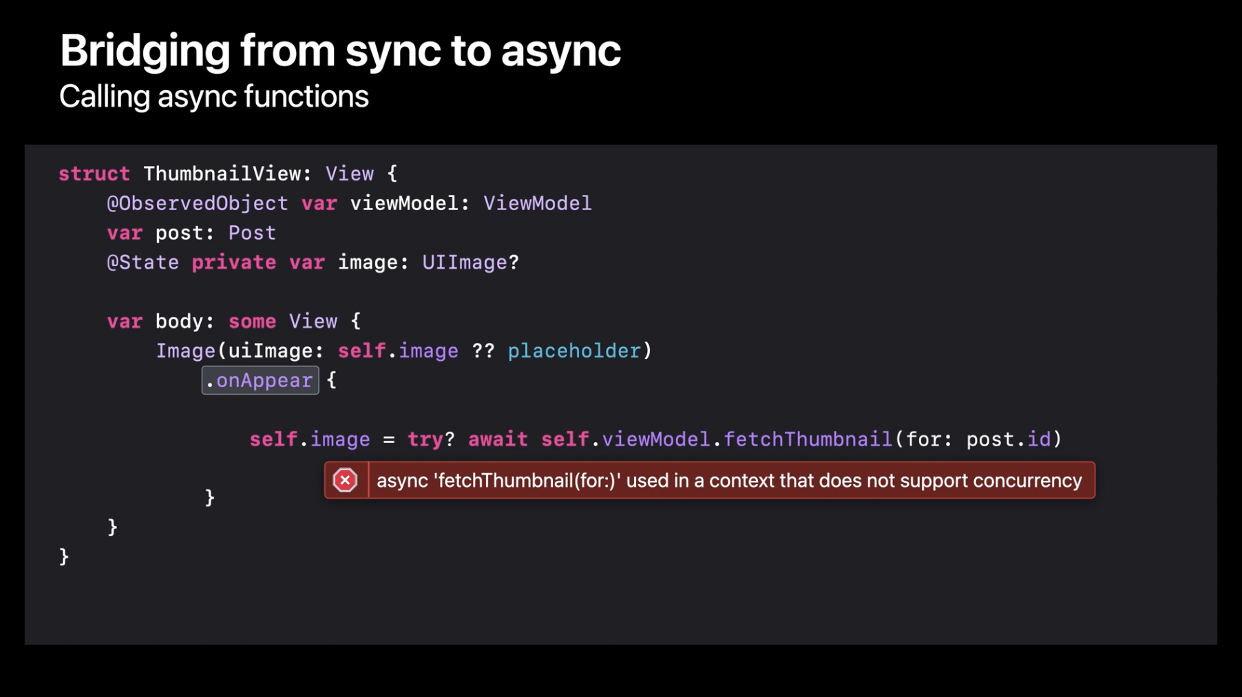 이미지 셀은 post와 함께 생성되며, 각 post에는 고유한 ID가 있습니다. 이 ID를 뷰 모델에 전달하면 비동기적으로 썸네일을 가져올 수 있습니다. 테스트 코드에서 이 호출을 변환하는 방법을 이미 보았으니 직접 시도해 보겠습니다. 먼저, 완료 핸들러를 제거합니다. 그 다음, 오류 처리를 위해 try를 추가하고, 비동기 함수 호출을 완료하기 위해 await을 추가합니다. 하지만 이렇게 변경한 후 빌드를 시도하면 문제가 발생합니다. Swift 컴파일러가 비동기 함수는 비동기 컨텍스트 내에서만 호출할 수 있다고 알려줍니다. 여기서 onAppear 수정자는 일반적인 동기 클로저를 사용하므로, 동기 코드와 비동기 코드를 서로 연결할 방법이 필요합니다.