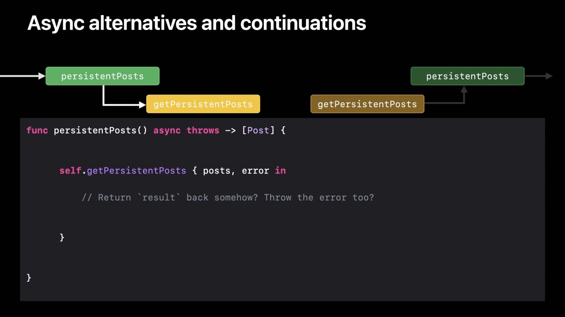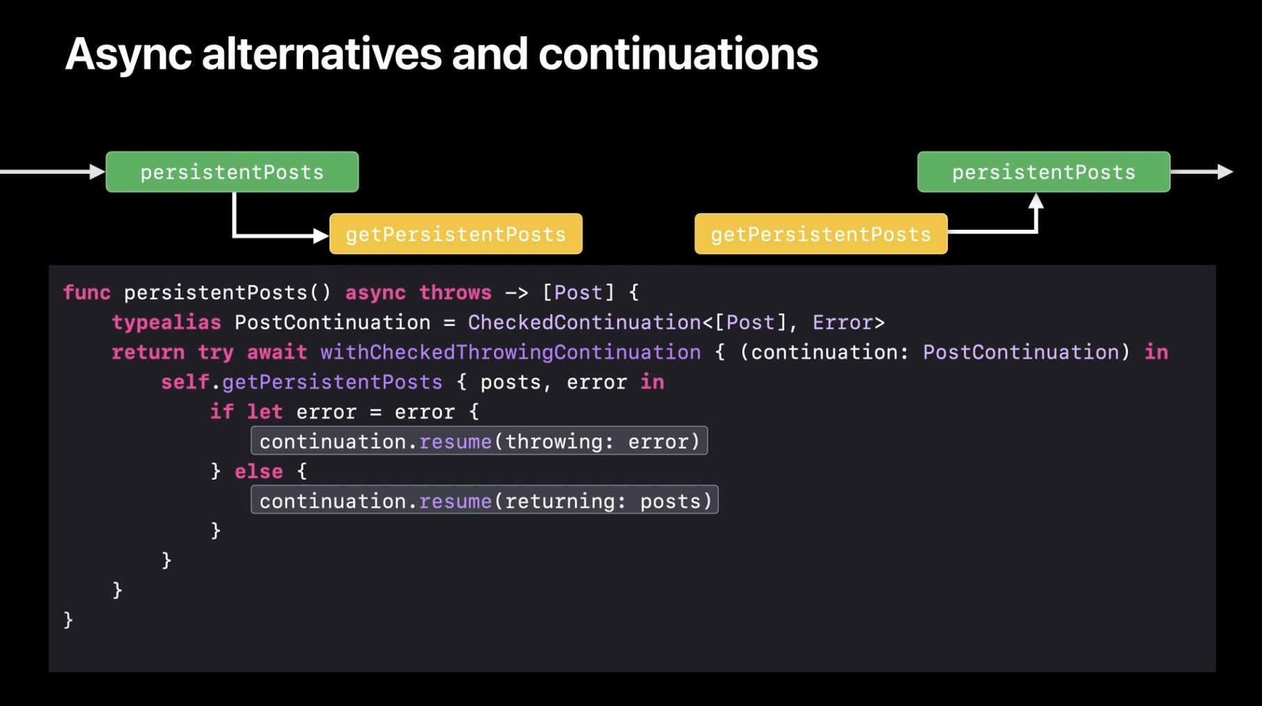 우리 예제로 돌아가서, 컨티뉴에이션을 활용하여 비동기 코드를 완성하는 방법을 살펴보겠습니다. withCheckedThrowingContinuation 함수는 오류를 포함하는 완료 핸들러에서 예외를 던질 수 있는 비동기 함수로 변환해 줍니다. 오류를 발생시키지 않는 함수의 경우, 대응되는 withCheckedContinuation을 사용할 수 있습니다. 이러한 함수들은 일시 중단된 비동기 함수 실행을 재개할 수 있도록 컨티뉴에이션 값을 제공하는 핵심 도구입니다. 이를 활용하면 getPersistentPosts 호출을 기다릴 수 있도록 연결하는 첫 번째 브리지를 구축할 수 있습니다.