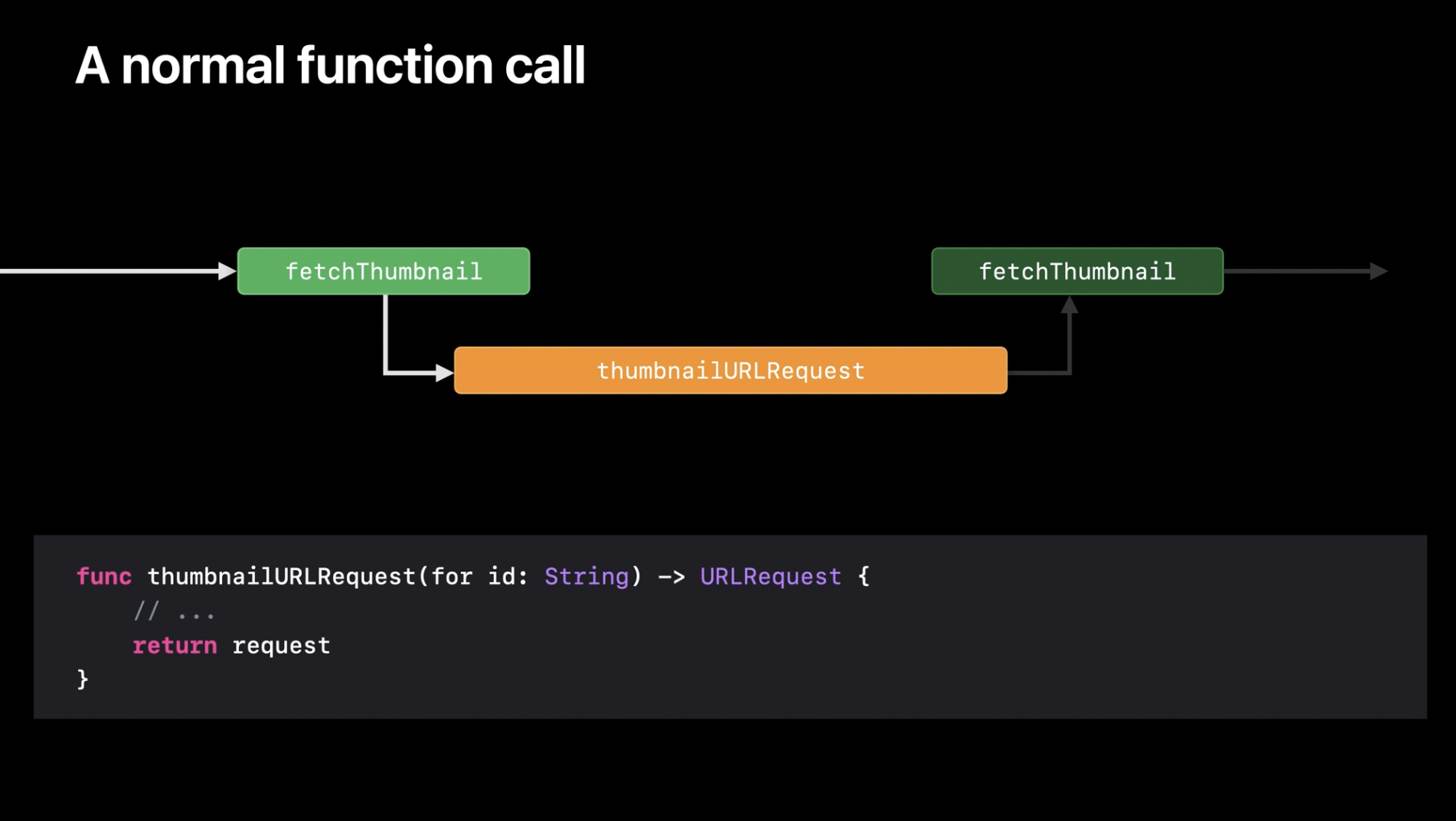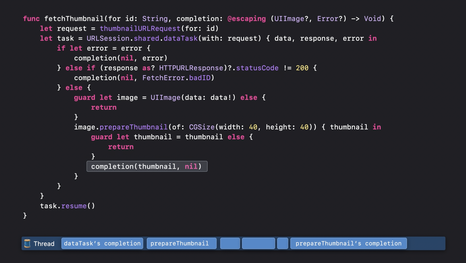어떤 함수를 호출하면 현재 실행 중인 스레드의 제어권은 해당 함수로 넘어갑니다. 여기서 thumbnailURLRequest와 같은 일반 함수를 호출하는 경우, 스레드는 해당 함수가 완료될 때까지 그 작업을 수행하는 데 완전히 점유됩니다.