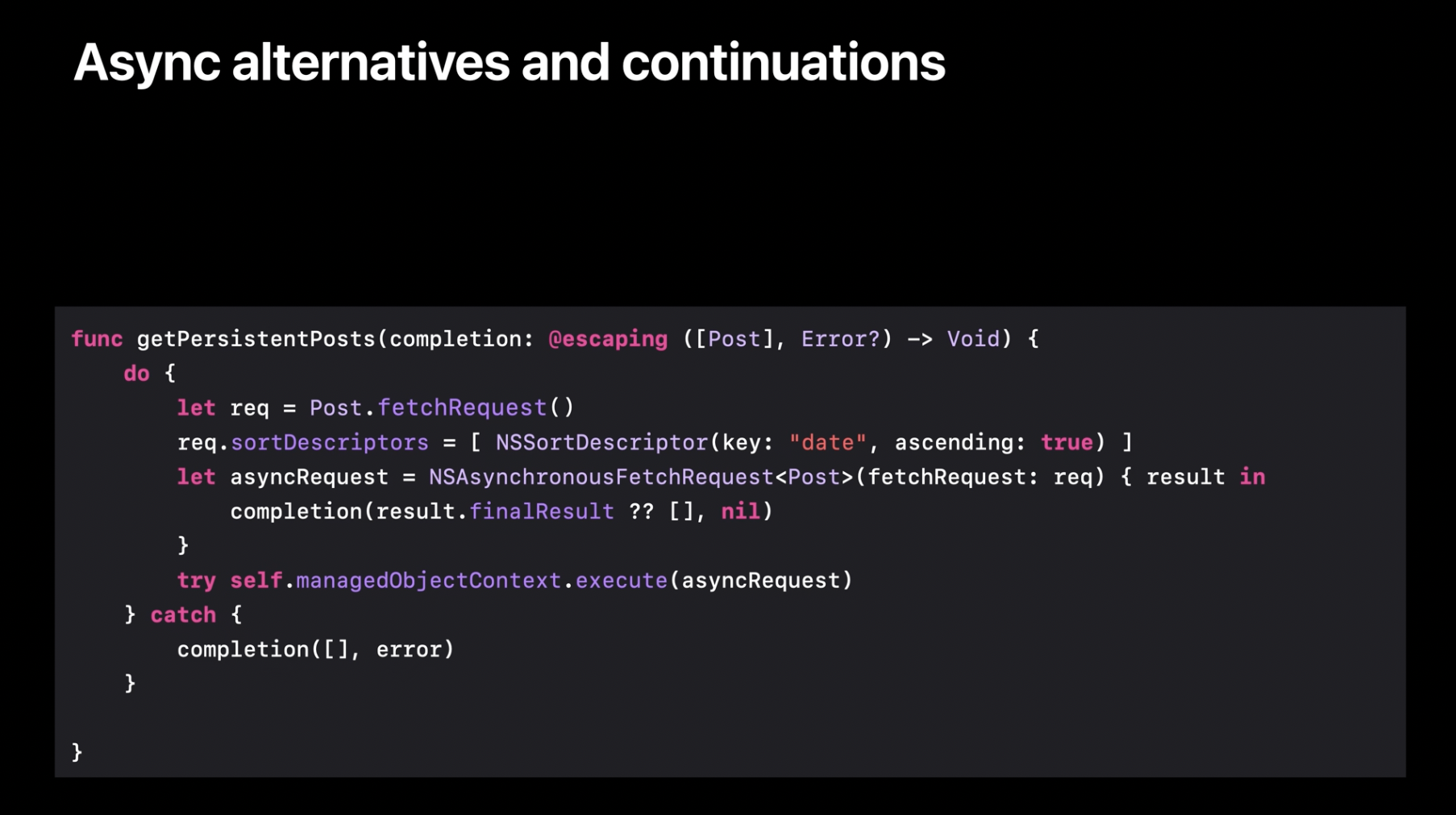 비동기 버전의 persistentPosts가 호출되면, Core Data에 데이터를 요청합니다. 그리고 나중에 Core Data가 완료 핸들러를 호출하여 가져온 결과를 전달합니다. 이 상황은 이전에 네이트가 보여준 사례와 거의 동일합니다. 당시 fetchThumbnail 함수는 Core Data가 아니라 시스템에 비동기 함수 호출을 재개하도록 요청했었습니다.