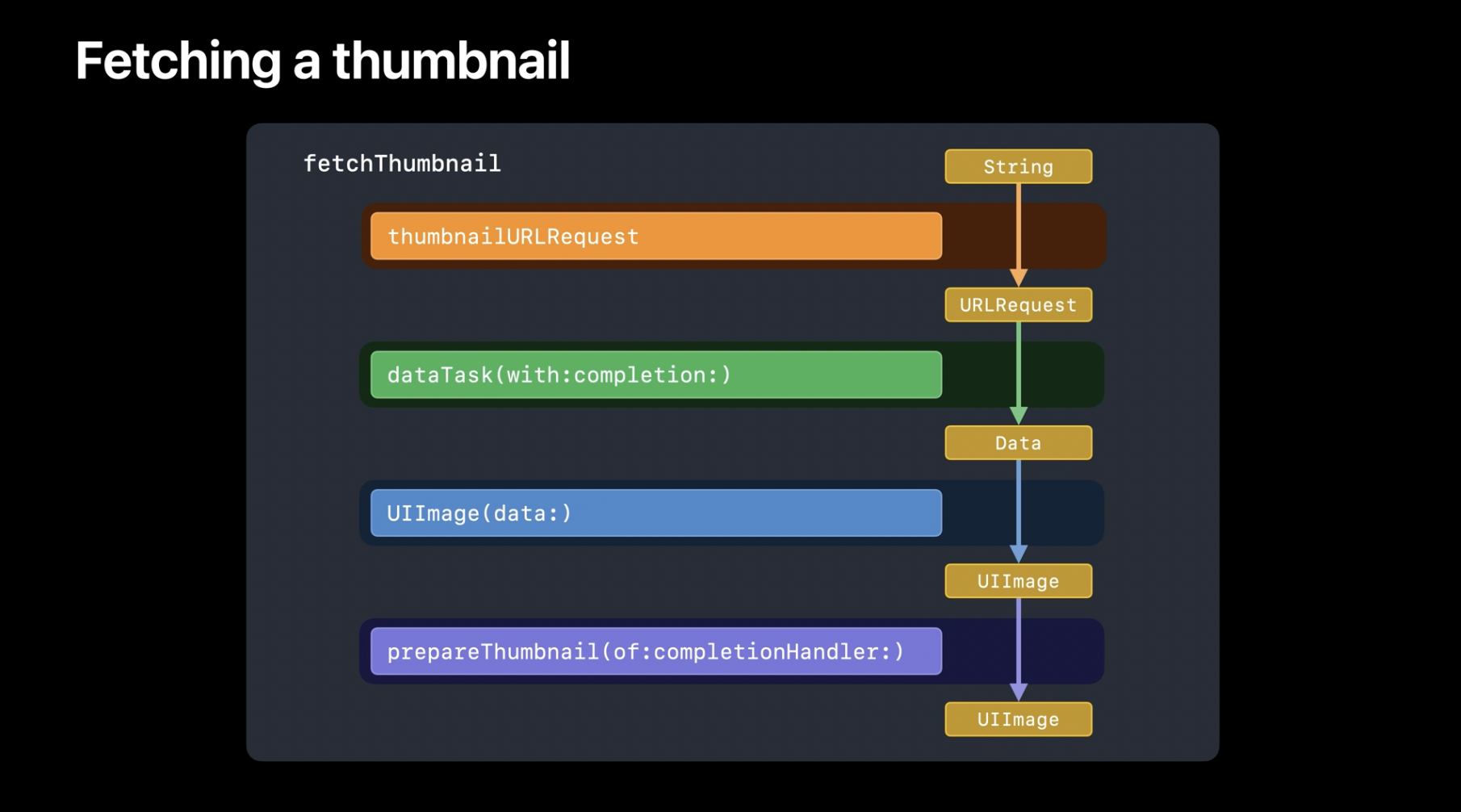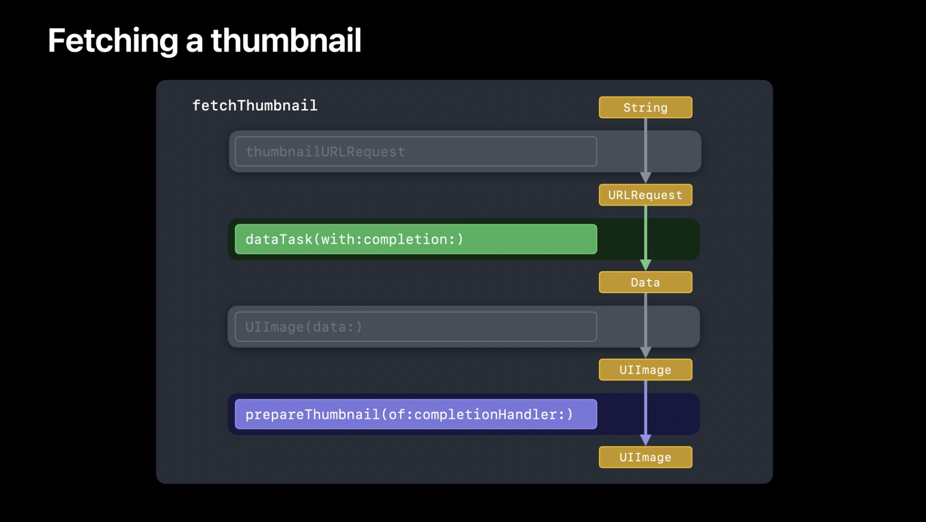 로버트와 제가 함께 개발하는 앱에는 항목 리스트가 있으며, 각 행에는 서버에 저장된 이미지의 썸네일이 표시됩니다. 리스트에 썸네일을 표시할 때가 되면, 뷰 모델에서 fetchThumbnail 메서드가 호출됩니다. 이 메서드는 문자열을 일련의 단계를 거쳐 UIImage로 변환합니다. 먼저, 뷰 모델의 thumbnailURLRequest 메서드가 문자열을 URLRequest로 변환합니다. 다음으로, URLSession의 dataTask 메서드가 해당 요청의 데이터를 가져옵니다. 그런 다음, UIImage의 initWithData 메서드가 해당 데이터를 이용해 이미지를 생성하고, 마지막으로 UIImage의 prepareThumbnail 메서드가 원본 이미지에서 썸네일을 렌더링합니다. 이러한 모든 작업은 이전 단계의 결과에 의존하기 때문에 순차적으로 수행되어야 합니다.