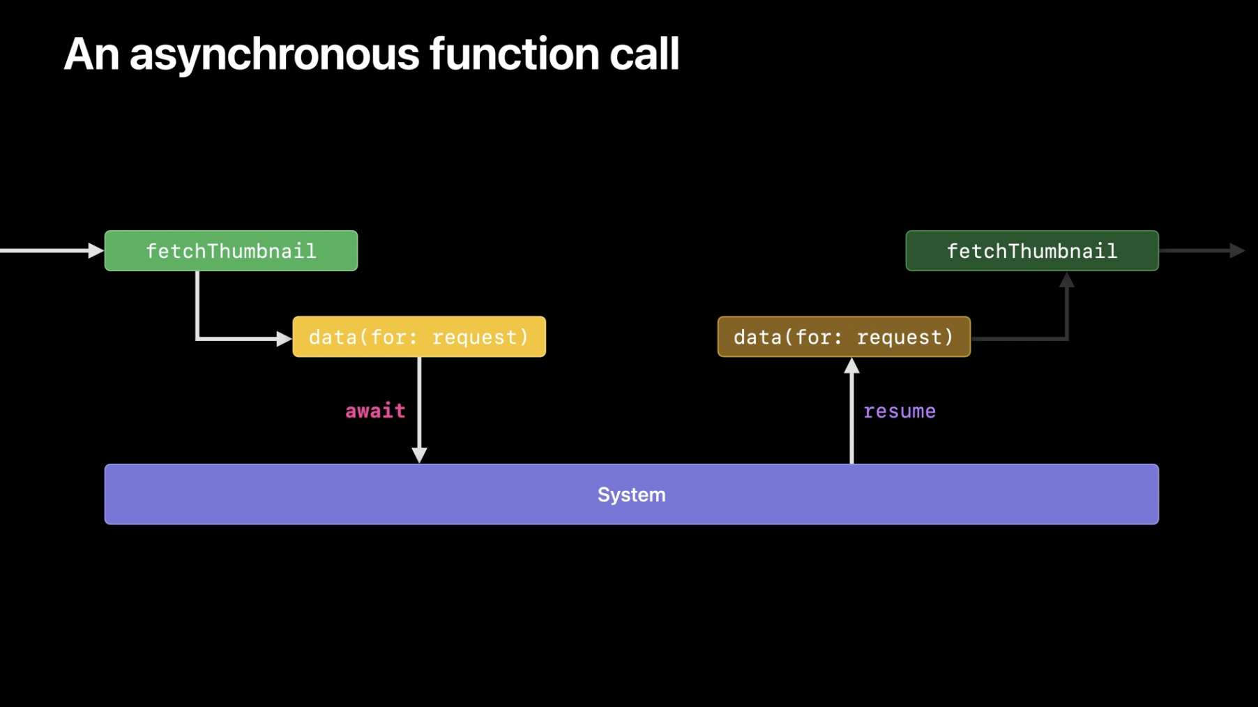 사용자의 반응을 처리하는 작업이 완료되면, URLSession의 data 메서드가 다시 실행될 수 있습니다. 하지만 시스템은 그 전에 다른 작업을 실행할 수도 있습니다. 마지막으로, data 메서드가 완료되면 fetchThumbnail 함수로 실행 흐름이 돌아옵니다. 비동기 함수가 일시 중단되는 동안 다른 작업이 수행될 수 있다는 사실은 Swift에서 비동기 호출에 await 키워드를 반드시 사용해야 하는 이유를 보여줍니다.